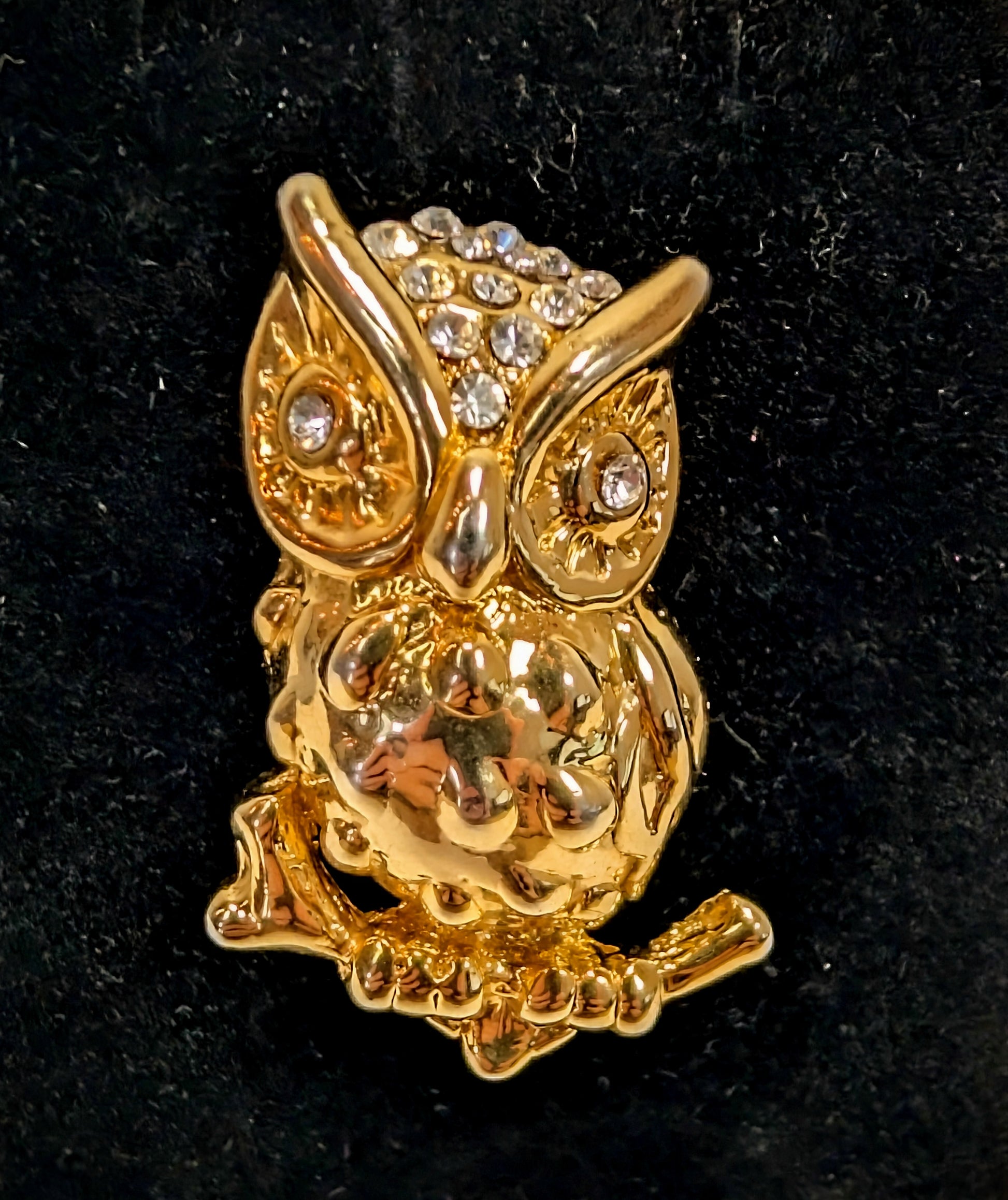 The owl motif in jewelry gained popularity in the 1970's with a resurgence since the 2010's. This particular piece is definitely one of the more pleasing owl pins out there