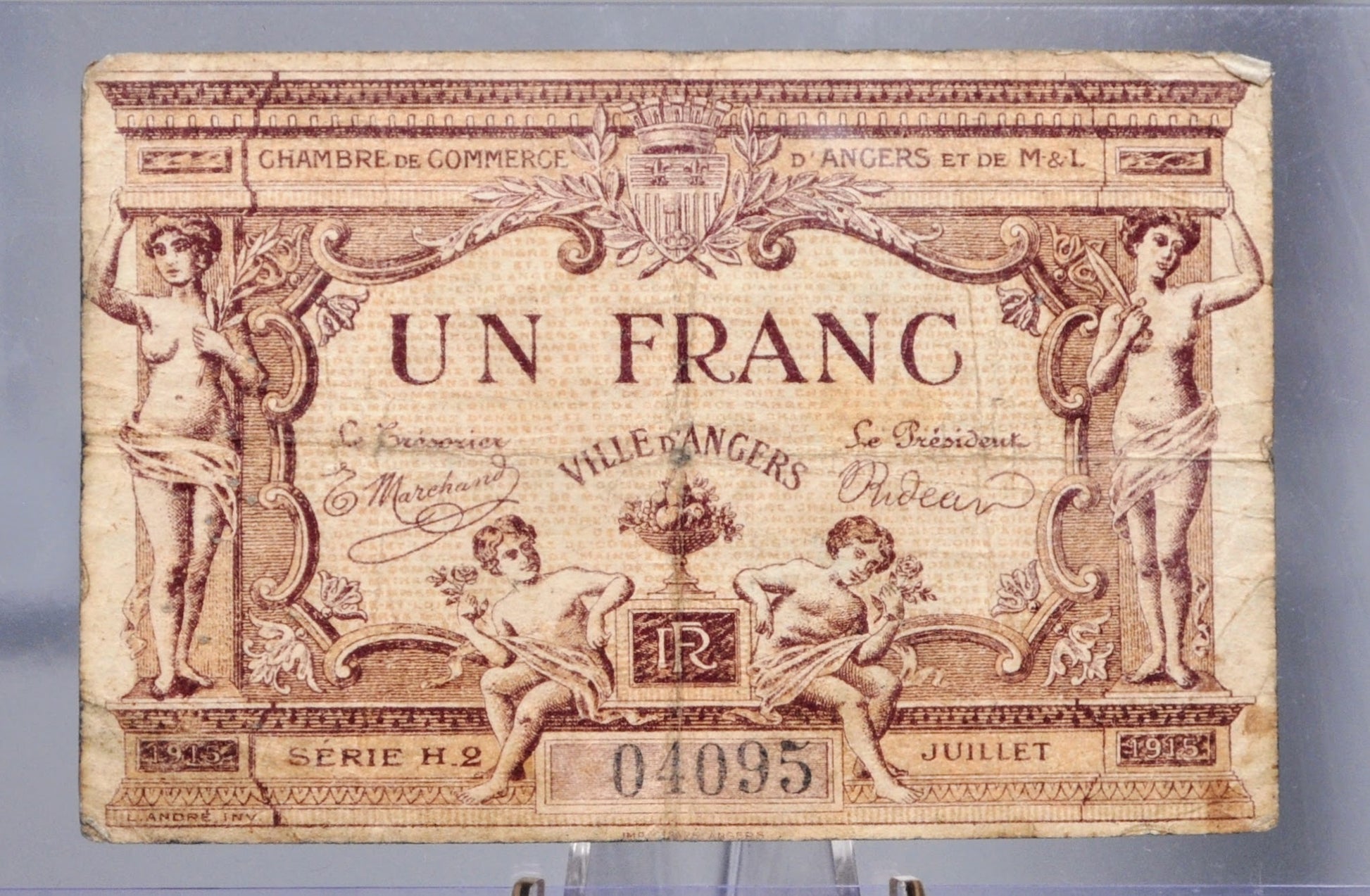 This listing is for the photographed 1915 (1917 Issue) Chamber of Commerce d'Angers 1 Franc Emergency Issue Note. These emergency notes were first issued in July of 1915 by the Angers Chamber of Commerce in response to the economic difficulties of France during World War I. This note was issued in 1917, as identified by the series number including a "2" at the end, this note is part of the "H.2" series. The obverse of this note features two caryatids and two cherubs on either side of the note, with the entire design representing a Greek style building. The reverse of this note has a similar building style frame with text inside that translates to "The bonds issued, guaranteed by a deposit of equal value, are exchangeable for ten or multiples of ten for banknotes of the Bank of France at the counters of the Angers branch. They must be presented for redemption before July 31, 1920, unless a decision extending this deadline is made." Stunning detailed and ornamented design. Very Fine (VF) grade/condition, some visible folds and signs of circulation, as pictured. Fantastic piece of history in excellent condition. This note is 104 years old this year!