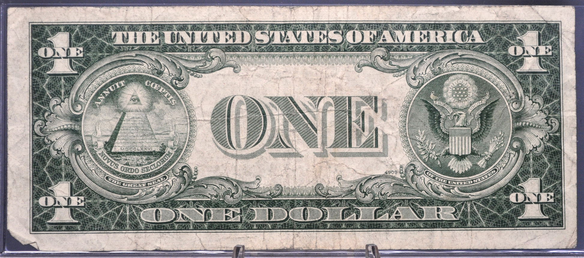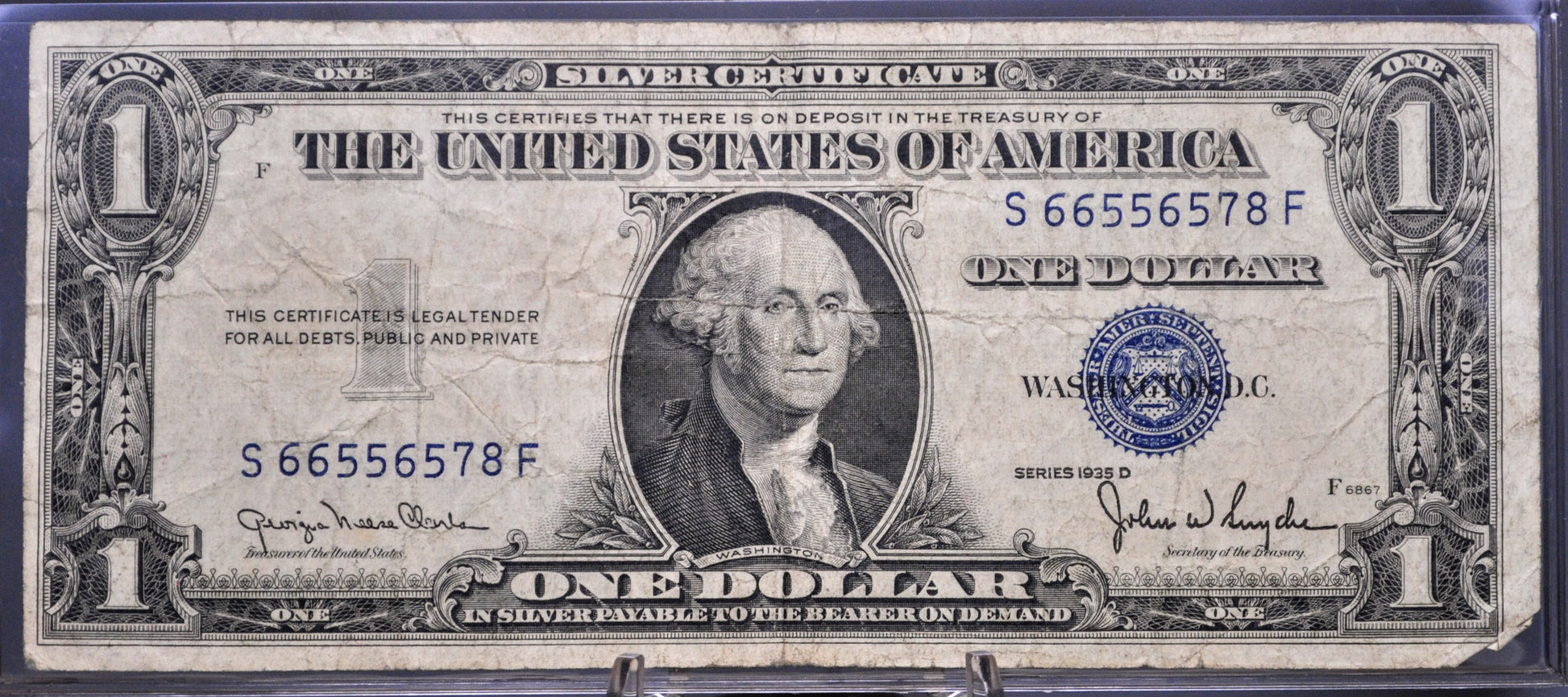 This listing is for the photographed 1935 D Silver Certificate 1 Dollar Fancy Gradual Ladder Pattern Serial Number Note. This is a narrow type of 1935D series note, differentiating it from the wider variant. The serial number for this note has a gradual ladder pattern, only consisting of the rising digits "5678", 66556578, making it a highly sought-after find! Very Fine (VF) grade/condition, some visible folds and signs of circulation, as pictured. A great novelty note for any collection! Fr#1613N (Friedberg number 1613N).