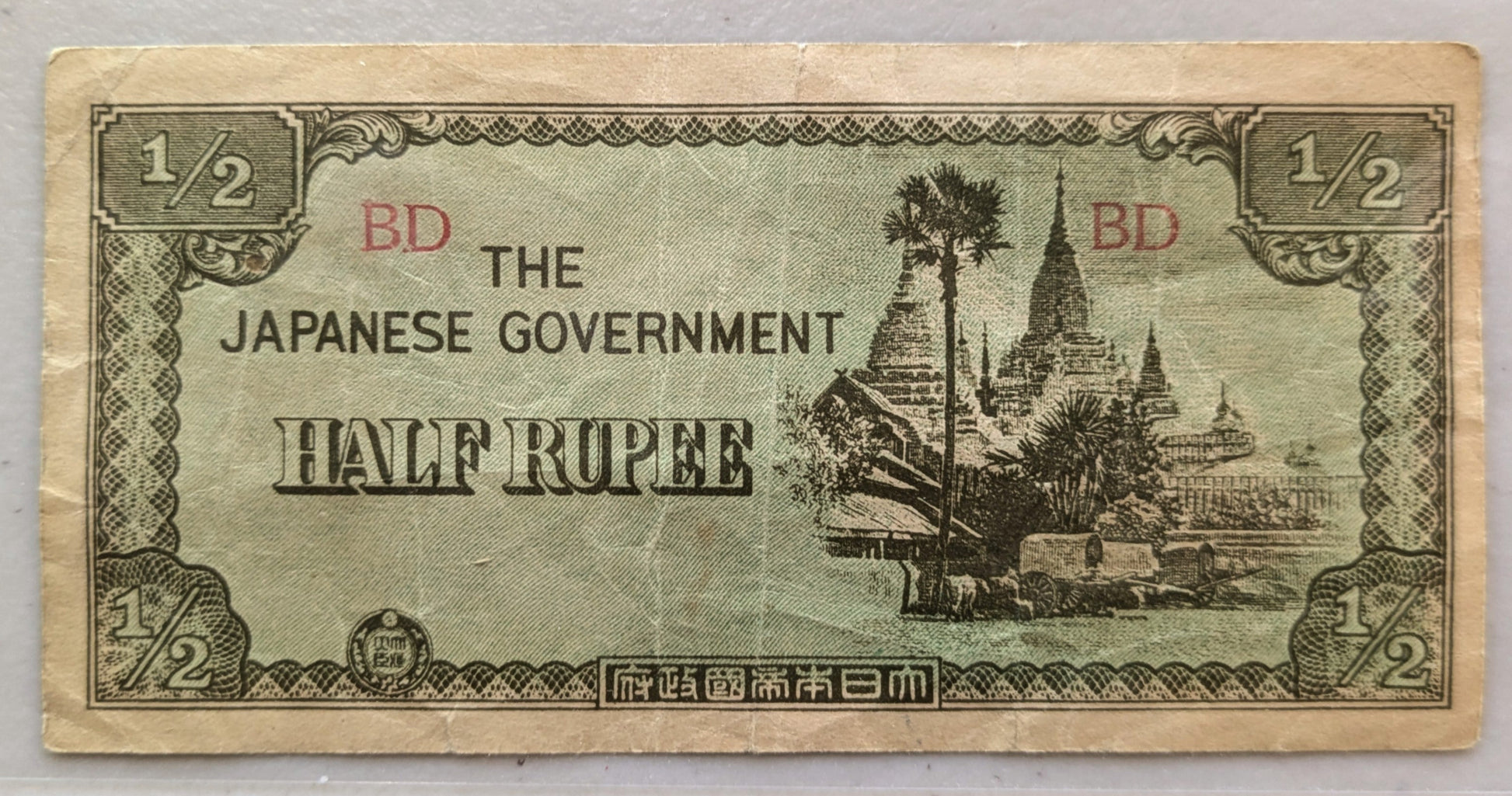 1942 Japanese Occupied Burma 1/2 Rupee Note - India Burma WWII Occupation - Series BD - 1942 Japanese Government Burma Half Rupee - P#13b