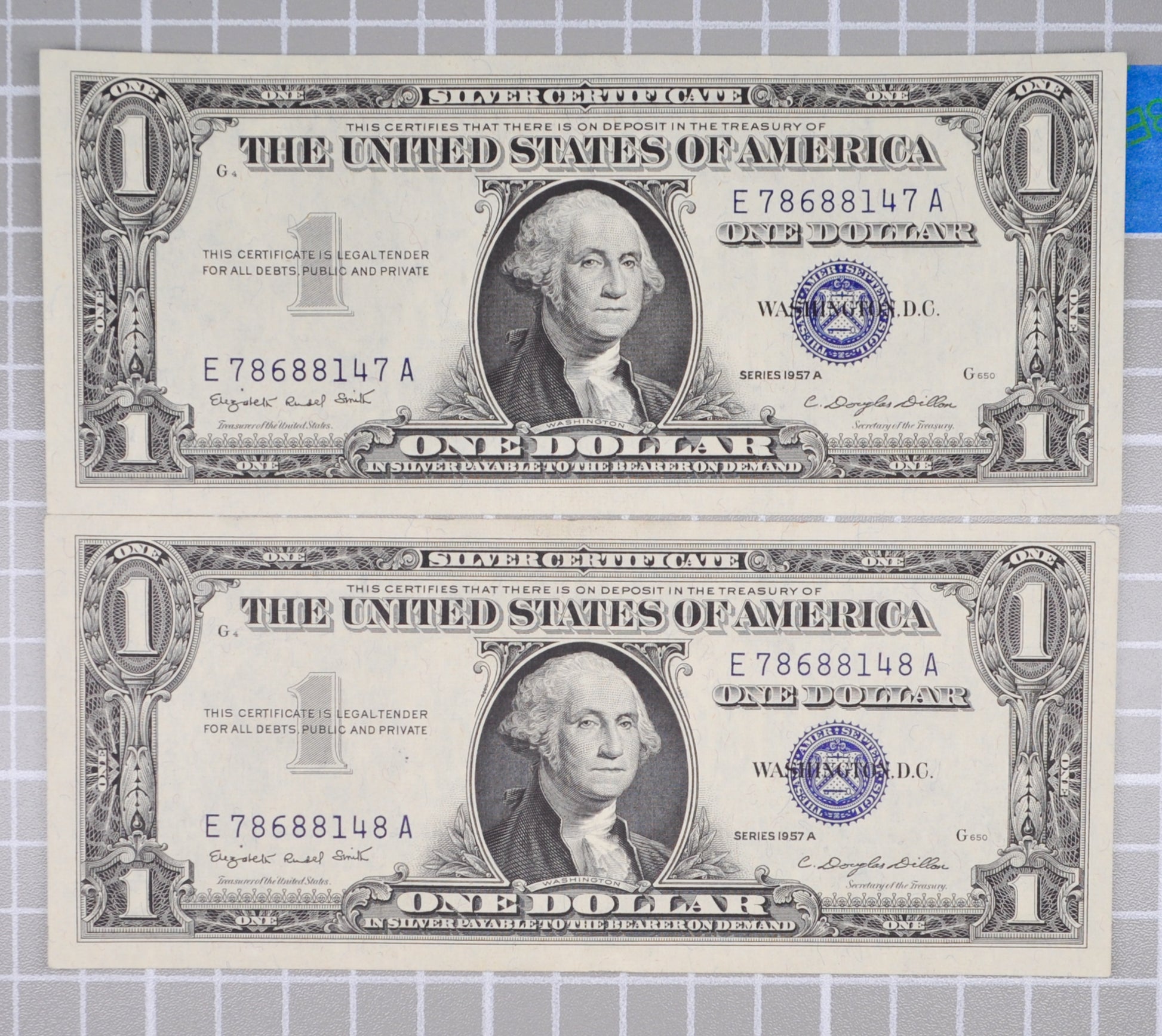 This listing is for the photographed Set of 2 1957-A One Dollar Silver Certificate Consecutive Serial Number Notes. Uncirculated (UNC) grade/condition, as pictured, crisp notes! These notes have the consecutive serial numbers of 78688147 and 78688148, or 78688572 and 78688573. Signed by Smith and Dillon. Great find, perfect addition to any collection! Fr#1620 (Friedburg Number 1620).