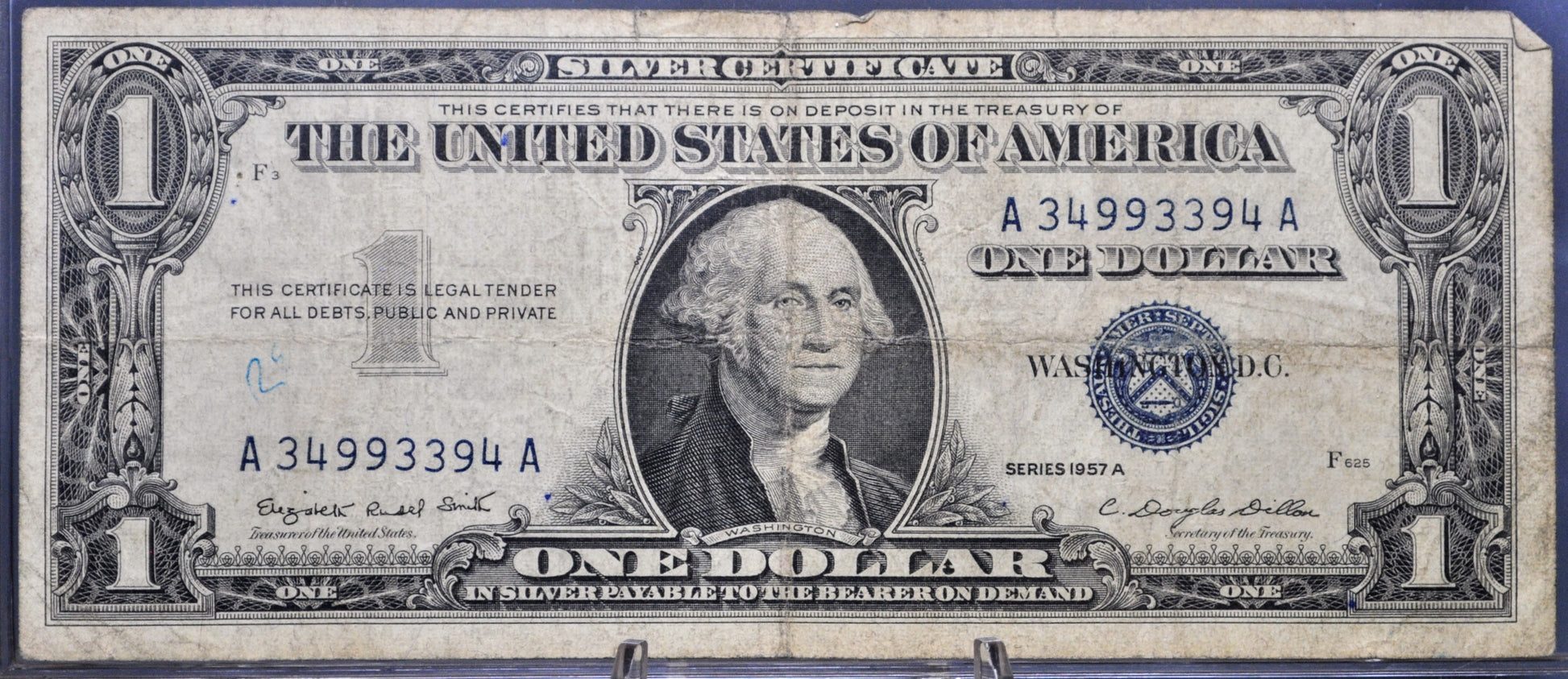 This listing is for the photographed 1957-A One Dollar Silver Certificate Fancy Serial Number Note. VF (Very Fine) grade/condition, as pictured. This note has an interesting trinary serial number, having only three digits repeated throughout the note, 34993394, making it a highly sought after find! Signed by Smith and Dillon. Great find, perfect addition to any collection! Fr.1620 (Friedburg Number 1620).