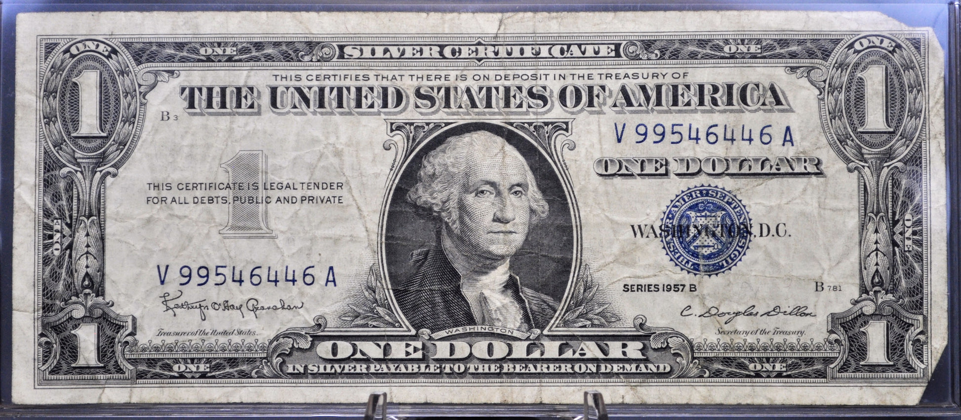 This listing is for the photographed 1957-B One Dollar Silver Certificate Fancy Serial Number Note. Very Fine (VF) grade/condition, as pictured. This note has an interesting repeating pattern and dual duo serial number, 99546446, making it a highly sought after find! Signed by Granahan and Dillon. Great find, perfect addition to any collection! Fr#1621 (Friedburg Number 1621).