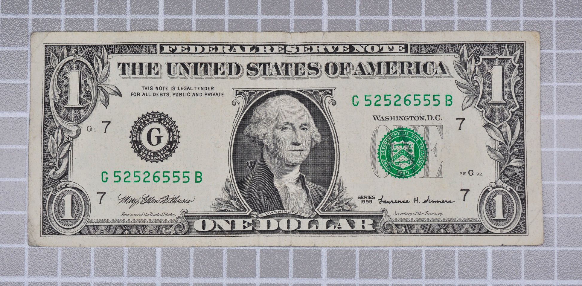 This listing is for the photographed 1999 Federal Reserve 1 Dollar Note with a Fancy Serial Number. Issued at the Federal Reserve Bank in Chicago, Illinois (G Seal). This note has a fancy trinary repeater serial number, consisting of the same three digits repeated across the serial number, 52526555. Extremely Fine (XF) grade/condition, some minor folds and signs of circulation. Friedberg Number 1925-G (Fr 1925-G). Great addition to any collection!