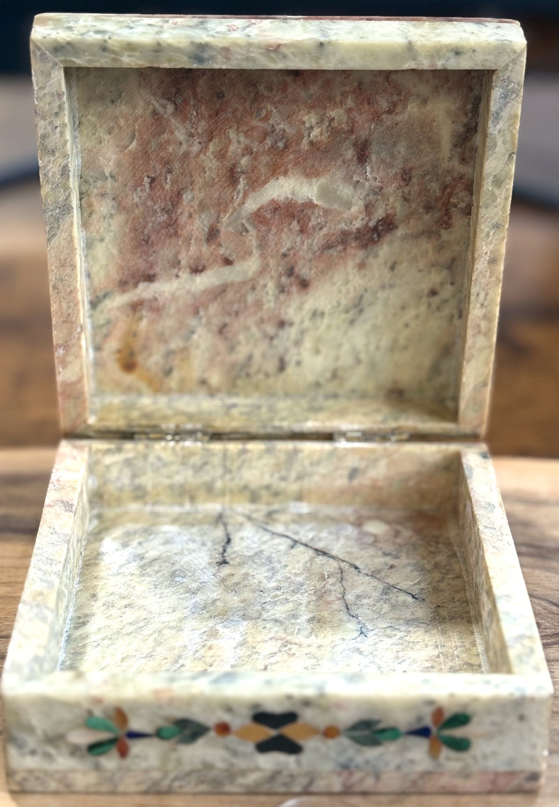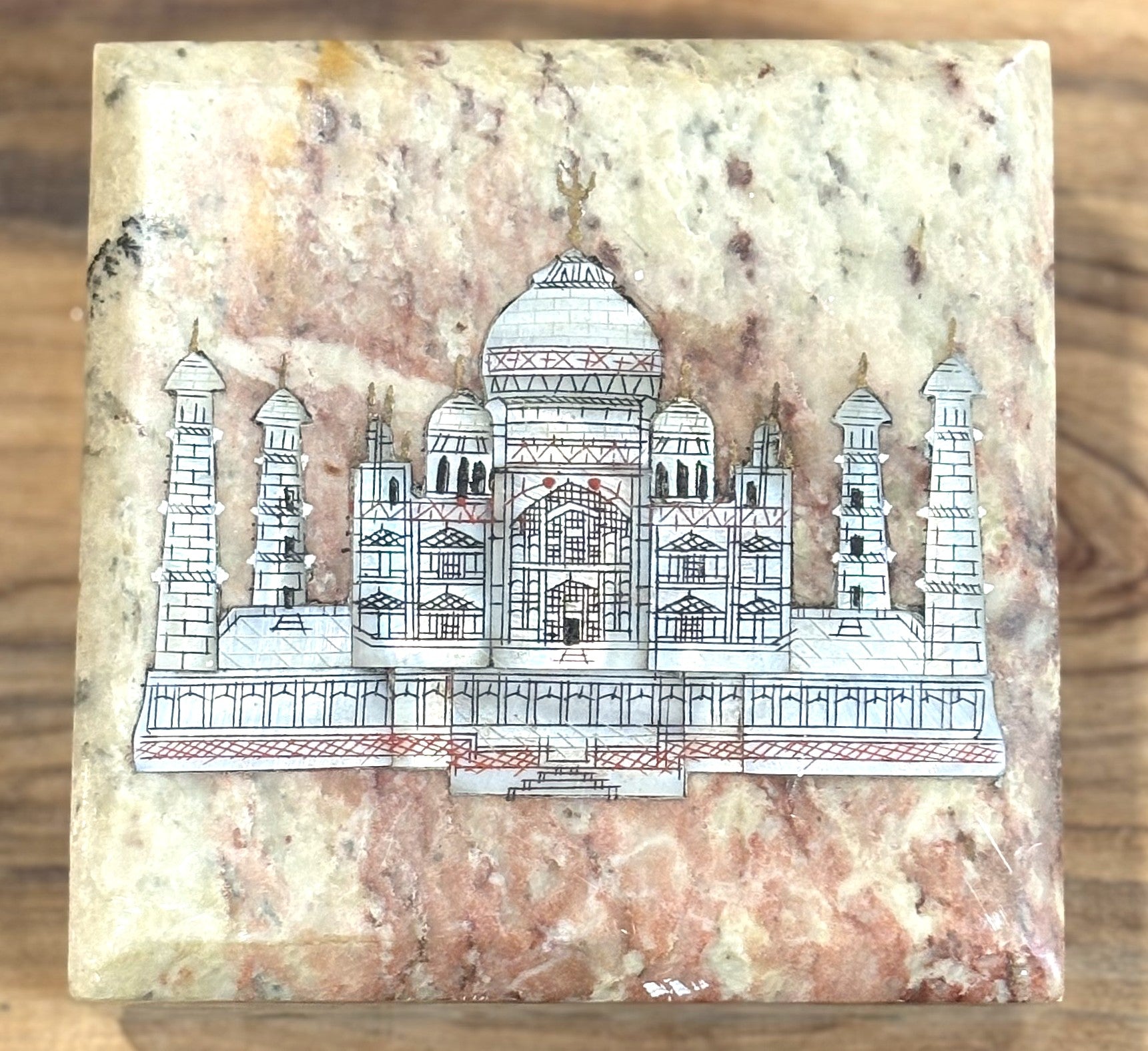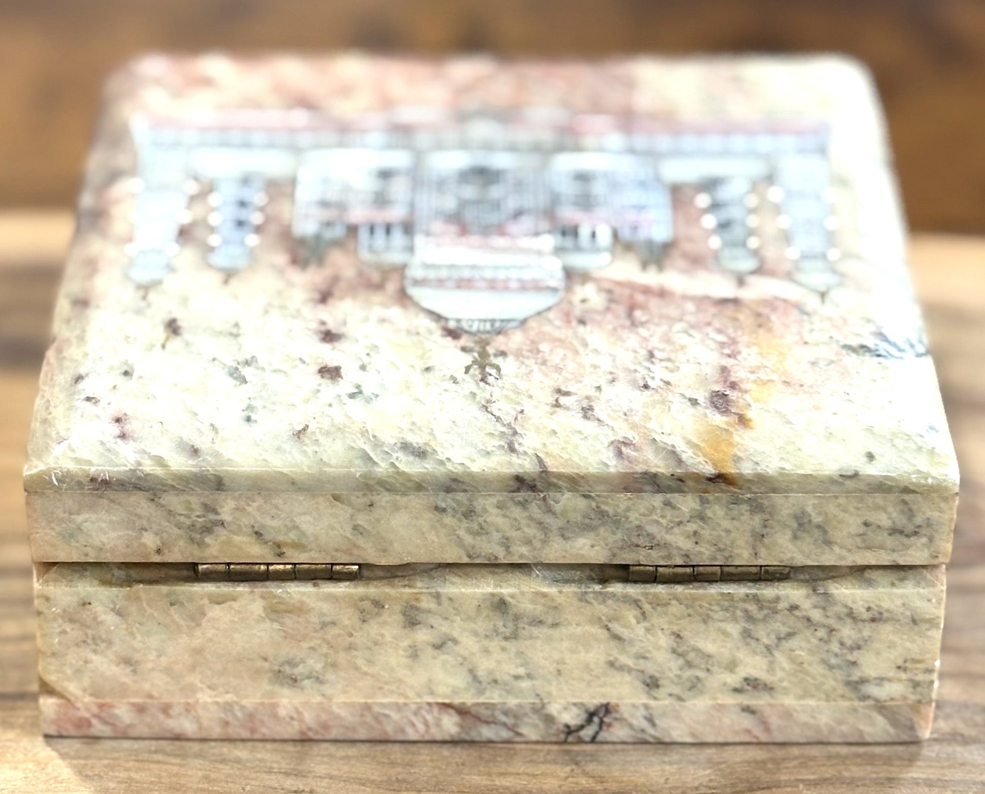 This listing is for the Antique Handmade Taj Mahal Mother-of-Pearl Inlay Jewelry Box. Commonly made from marble, soapstone, or sandstone, with mother-of-pearl, Abalone Shell, or other materials used for the inlay. The inlay technique involves carefully cutting and setting pieces of shell or stone into engraved grooves in the box's surface, a craft often associated with regions like India and the Middle East. This jewelry box specifically features a beautifully crafted inlay of the Taj Mahal in great detail. This Box also has the top attached to the box with a hinge. The Box features details on the side of the box utilizing a handful of different stones, such as Lapis, Malachite, Tigers Eye, Carnelian, and Jasper. Beautiful and Unique Item, such a great find!!!