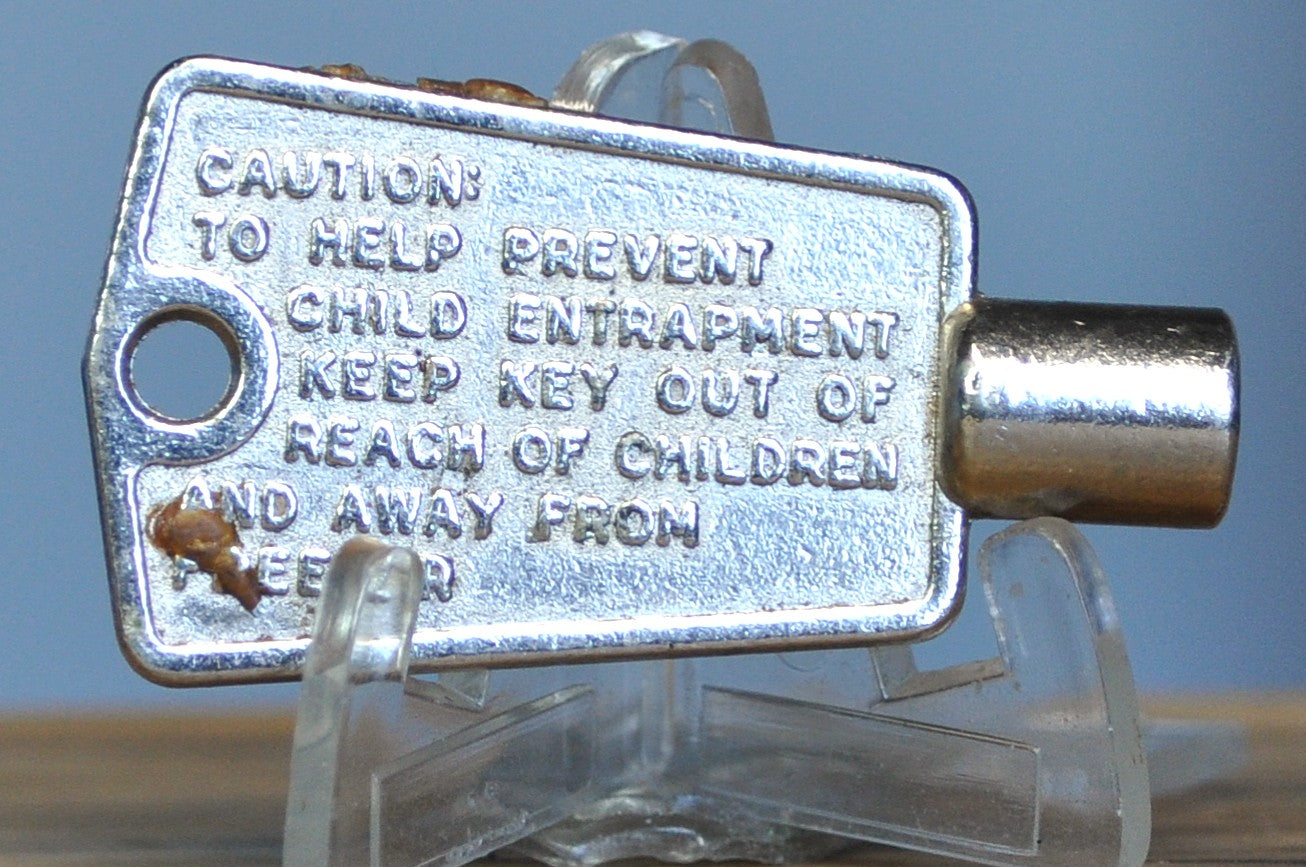 This listing is for the National Lock Rockford freezer key. Keys like this one were commonly used on old chest freezers and cabinets. Since the company is no longer the primary manufacturer of these keys. Interesting Find!!!
