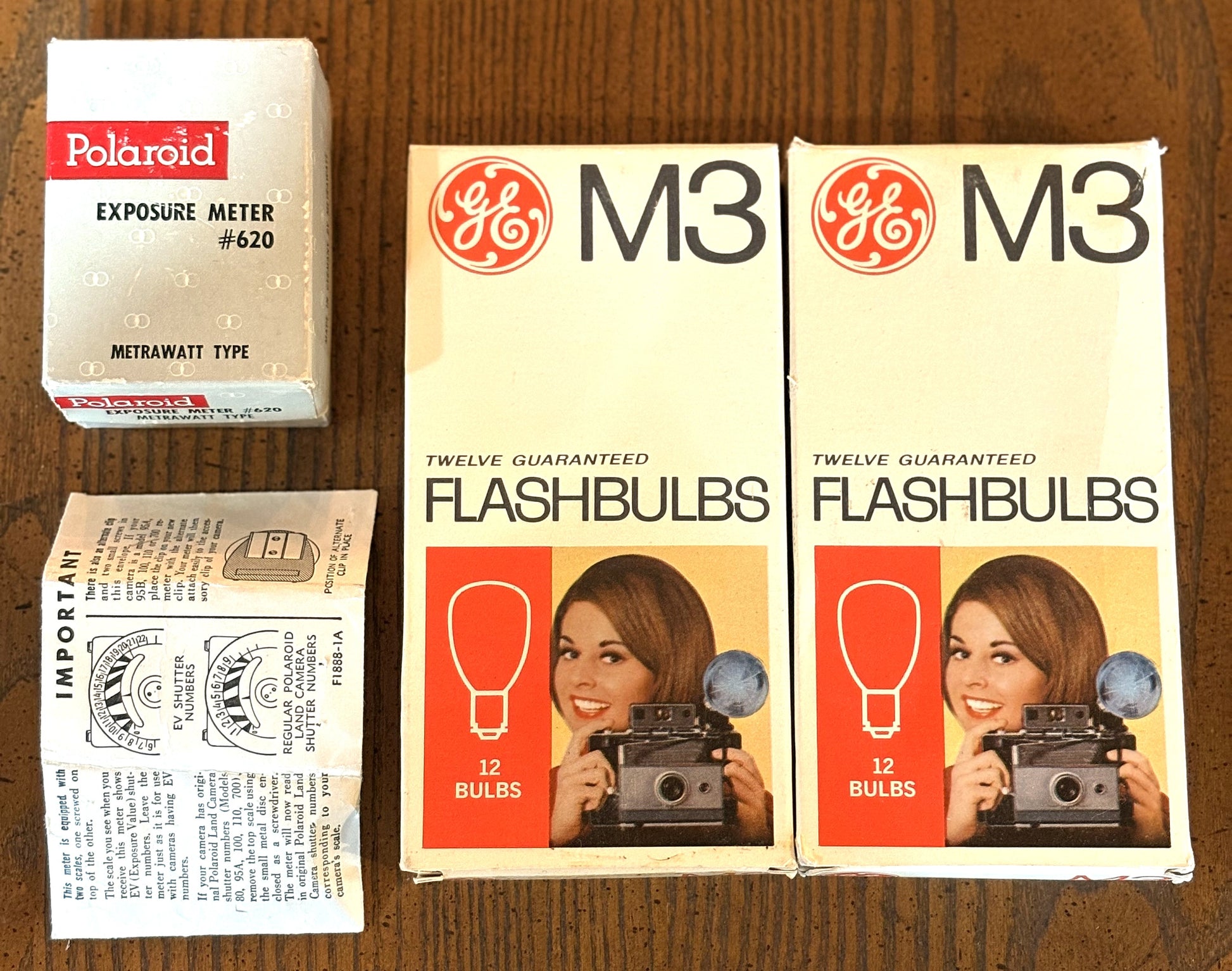 This listing is for the Vintage Polaroid/General Electric Photography Accessories Lot. This lot includes a collection of vintage photography equipment and accessories. The centerpiece is a Polaroid exposure meter, Metrawatt Type light meter, with its original box and an instruction sheet for use with various Polaroid Land Camera models. The lot also contains two boxes of GE M3 flashbulbs, which are vintage, clear, and "guaranteed" flashbulbs, with some bulbs missing from each box; in total, there are 19 bulbs. These bulbs were produced in the late 1950s and were known for being powerful and compatible with many cameras of that era. The instruction sheet for the exposure meter also references a small metal disc, identified as an "alternate clip," used to change the meter's scale. All items are suitable for collectors of vintage cameras and photography memorabilia.