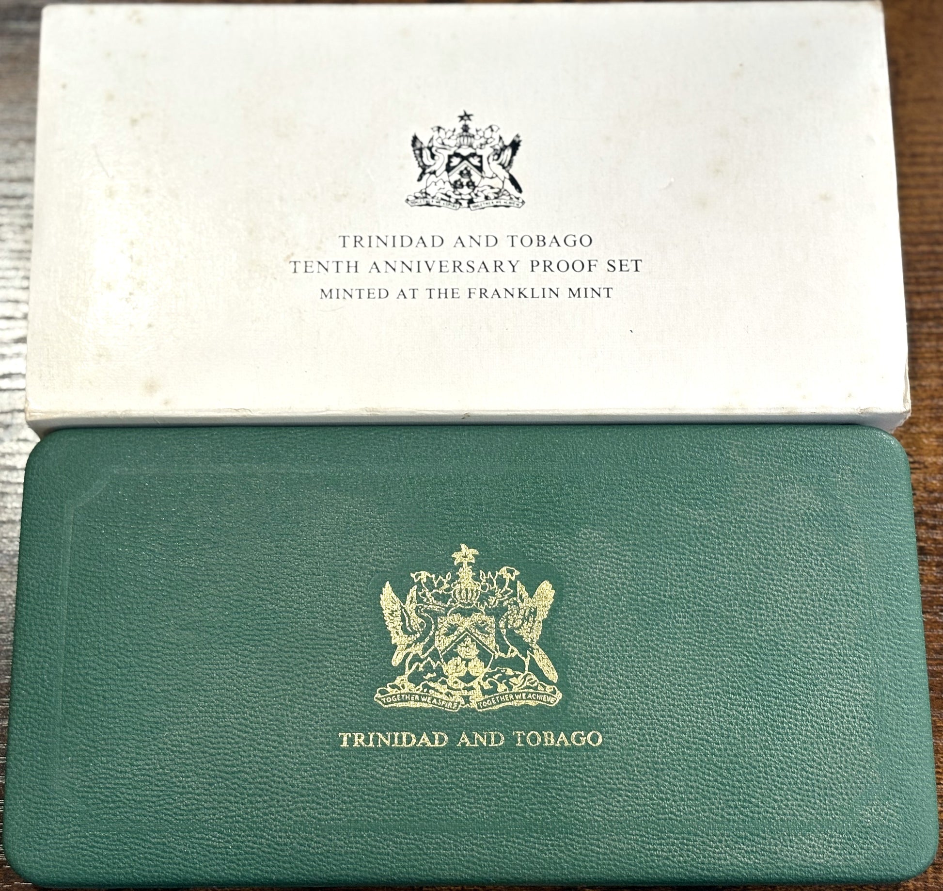 This listing is for the Trinidad and Tobago Tenth Anniversary Proof Set. These sets were issued around 1972 or 1973, commemorating the tenth anniversary of Trinidad and Tobago's independence from British rule, which occurred in 1962. This set is collectible items, especially for those interested in world coinage, the history of Trinidad and Tobago, or the work of The Franklin Mint.