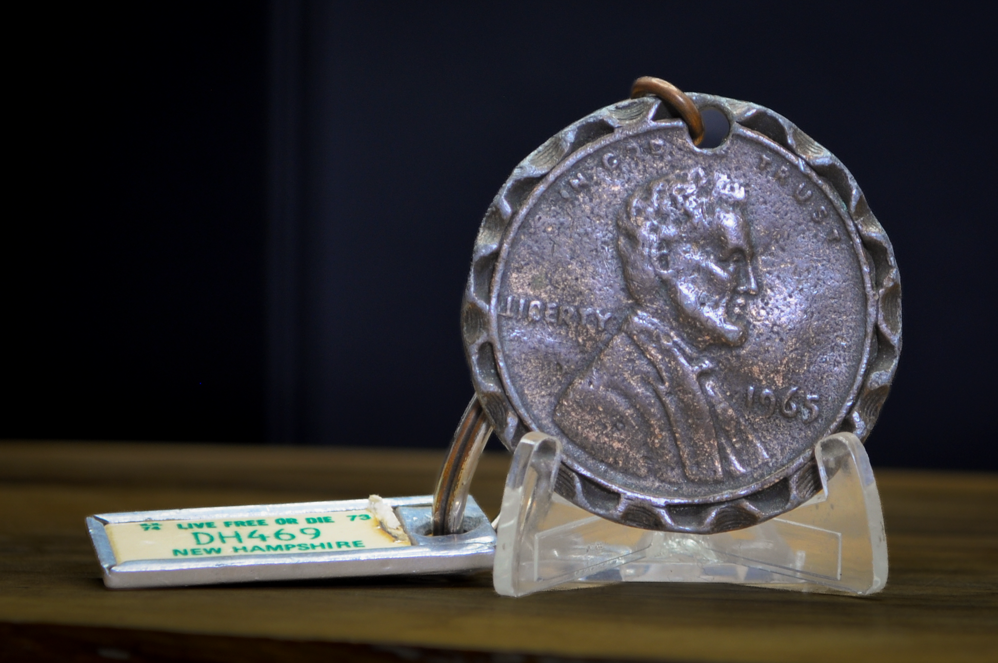 This listing is for the 1969 Lucky Penny Keychain with 1973/74 New Hampshire "Live Free or Die" Mini License Plate Tag DH469. Bring a piece of American history to your keys with this unique vintage keychain set. This listing features an oversized 1969 Lincoln Penny paired with a rare New Hampshire miniature license plate tag. These mini-plates were originally distributed by organizations, such as the Disabled American Veterans (DAV) as a key-return service.