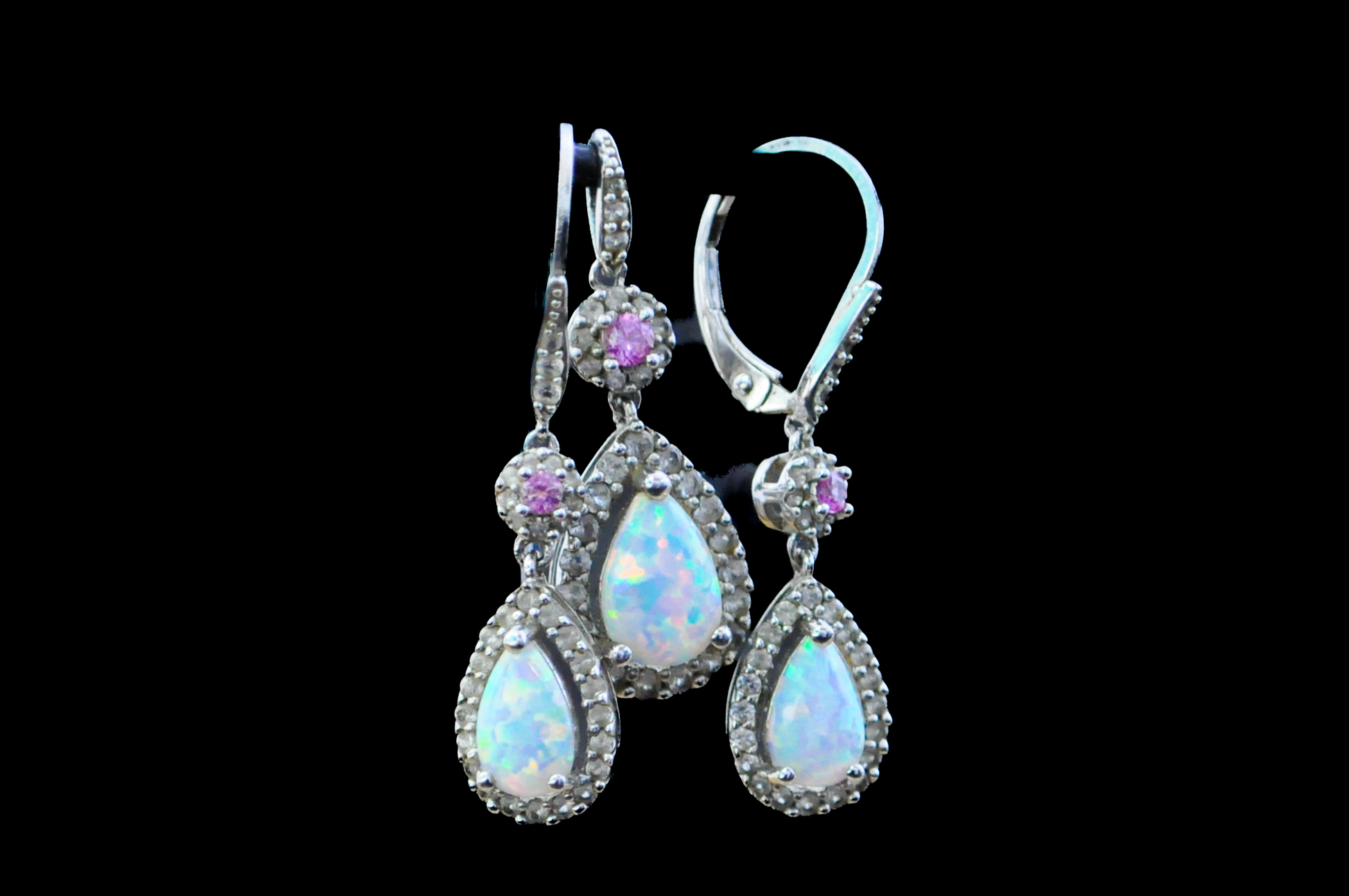 Sparkling Opal and Amethyst Teardrop Earrings with Charm - Stamped and Tested Sterling Silver - P★W Jewelry - Cubic Zirconium Studded