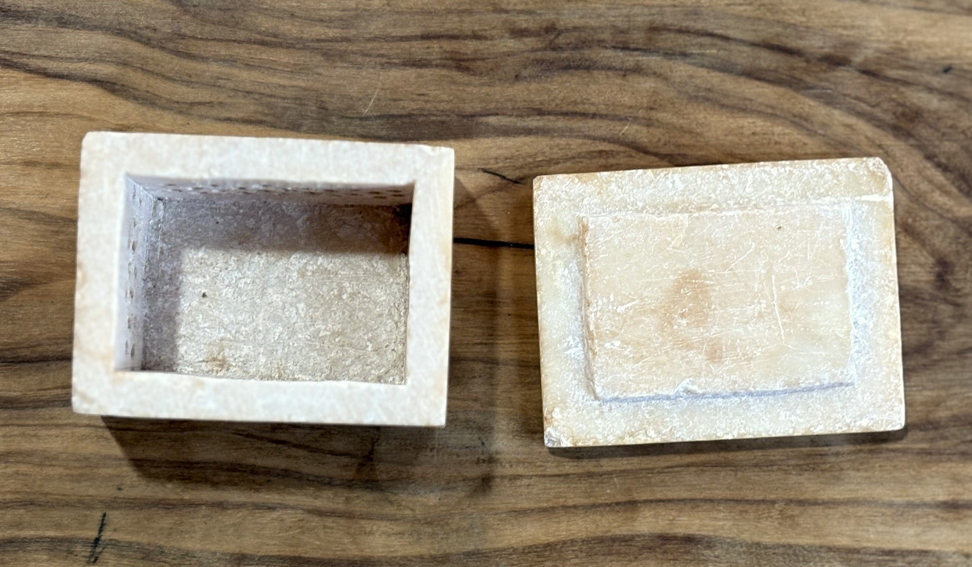 This listing is for the Antique Handmade Hand-carved Soapstone Trinket Box. Commonly made from marble, soapstone, or sandstone, with mother-of-pearl, Abalone Shell, or other materials used for the inlay. The inlay technique involves carefully cutting and setting pieces of shell or stone into engraved grooves in the box's surface, a craft often associated with regions like India and the Middle East, with historical connections to places like the Taj Mahal. These boxes are primarily used for storing small items like jewelry, rings, or other keepsakes, serving both a functional and decorative purpose. Beautiful Find!!!
