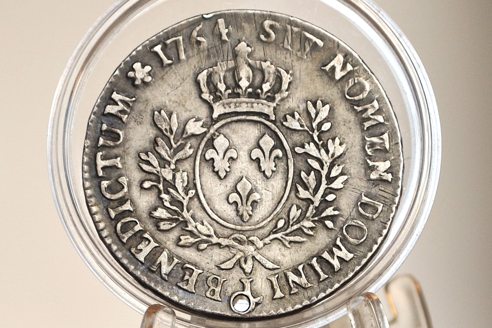 1764 ECU France, Bayonne Mint XF Detail, Holed - Louis XV - French Silver ECU 1764, SIT NOMEN DOMINI BENEDICTUM - 1700s Silver Coin
