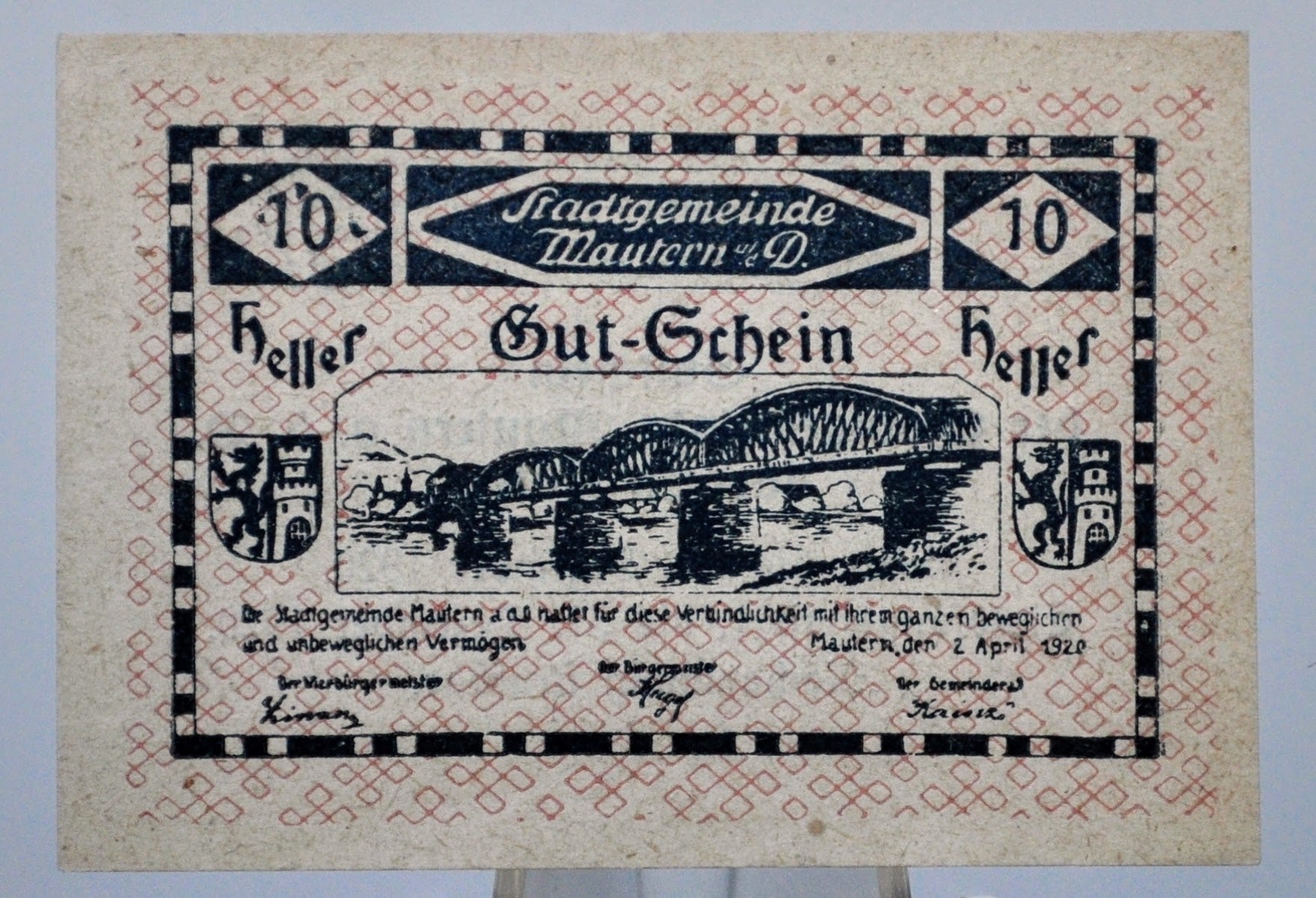 1920 Mautern an der Donau Austria 10 Heller Notgeld - Red Lattice Underprint - Austrian Emergency Currency - 1920 Austria Ten Heller Note