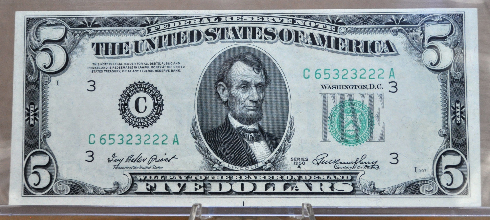 1950-A US 5 Dollar Fancy Serial Number Note - 65323222 - Philadelphia (C) Issue - 1950A Five Dollar Federal Reserve Note - Fr.1962-C
