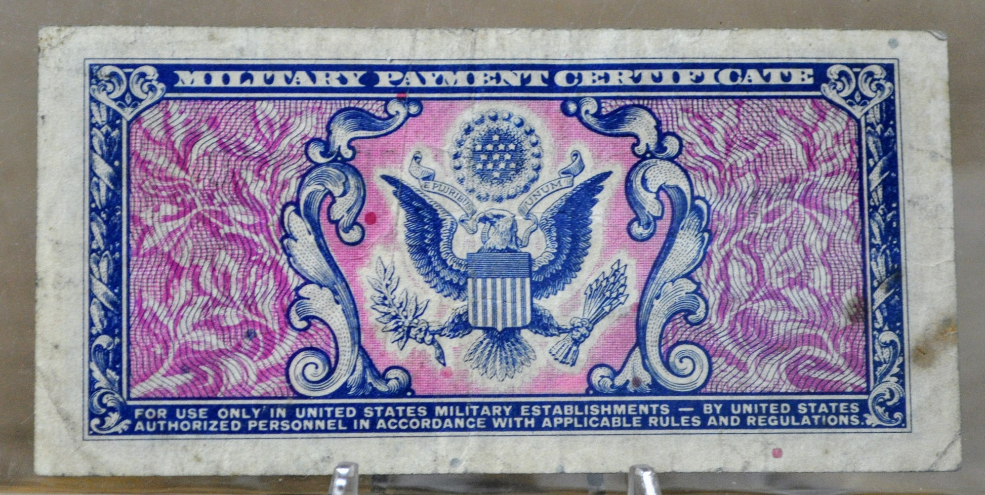 Military payment certificates, or MPC, were a form of currency used to pay U.S. military personnel in certain foreign countries. They were used in one area or another from a few months after the end of World War II until a few months after the end of U.S. participation in the Vietnam War – from 1946 until 1973. MPC utilized layers of line lithography to create colorful banknotes that could be produced cheaply. Fifteen series of MPCs were created. However, only 13 series were issued. The remaining two were largely destroyed, although some examples remain. Among the 13 released series a total of 94 notes are recognized.