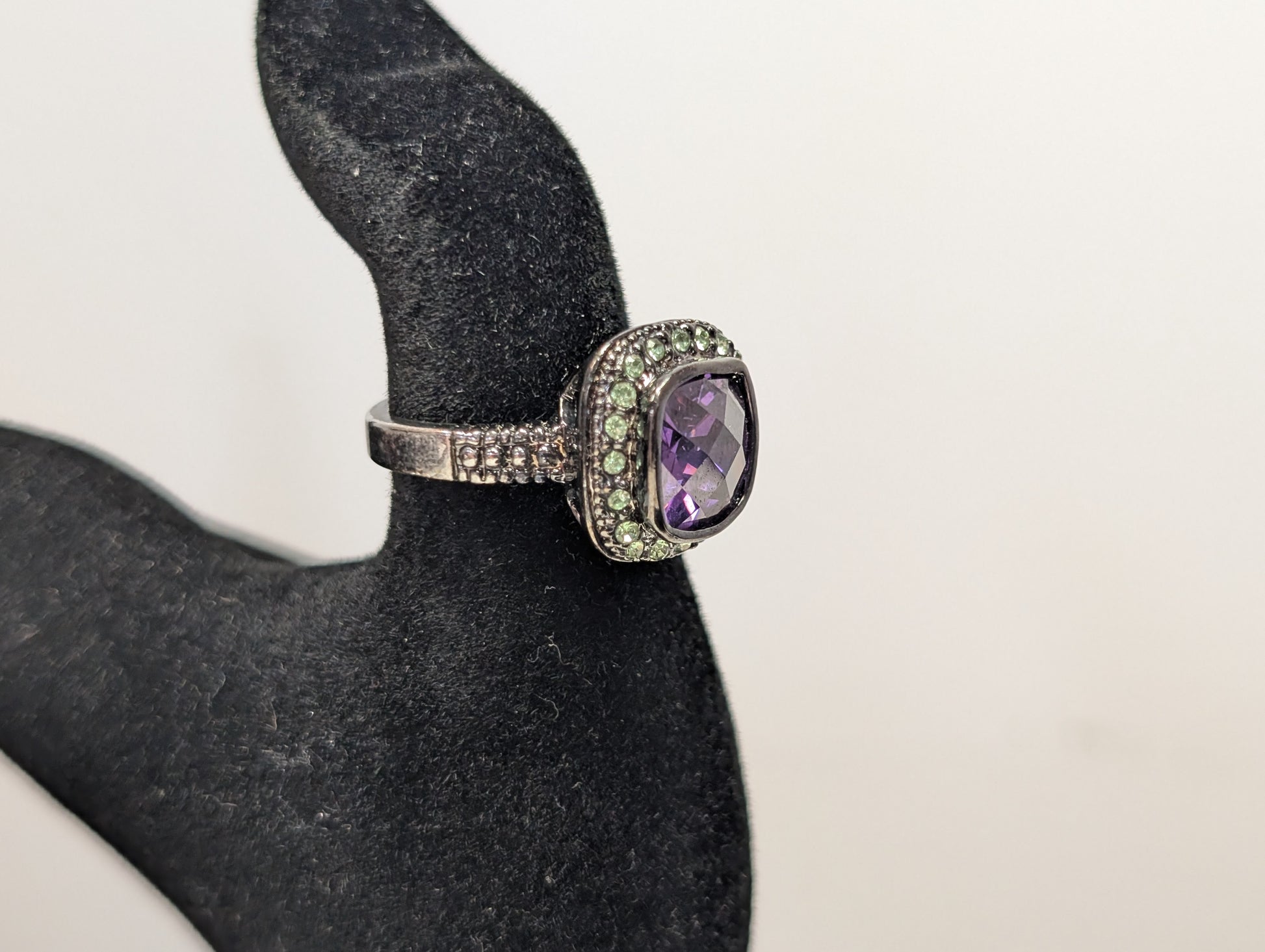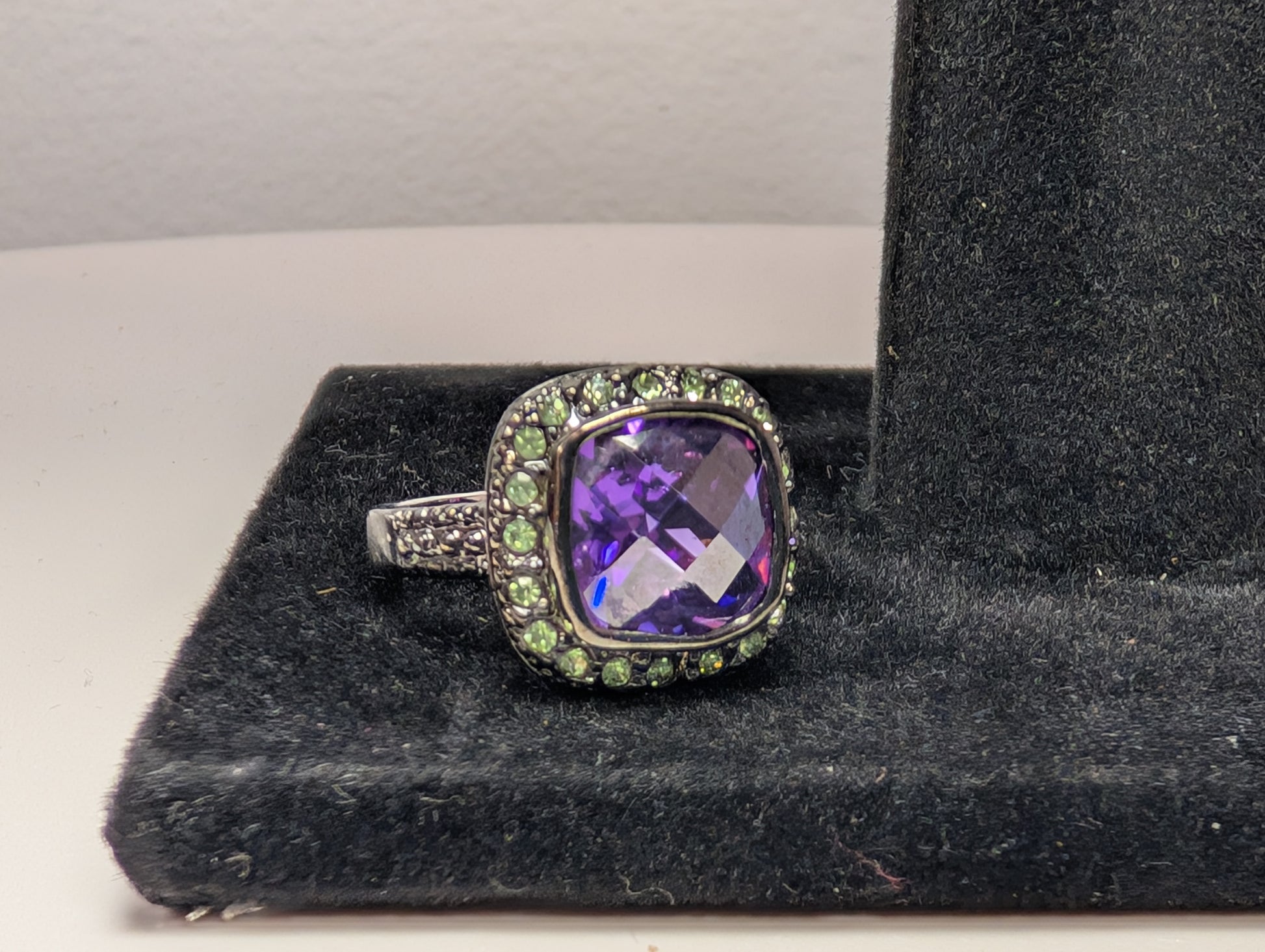 This listing is for the photographed Incredibly Detailed Green Sapphire & Amethyst Ring - Size 7. Beautiful ring with so much detail that features a large amethyst stone in the center of the ring, adorned by green sapphire gems lining the dome of the ring, with the underside containing an assortment of cutout hearts that lead into the raised bump and grooved shoulders of the ring. Amethyst is believed to have many spiritual properties, mostly associated with peace, protection, and spiritual awareness. Green sapphires are believed to symbolize compassion, loyalty, and trust. Amazing and dazzling ring for all.