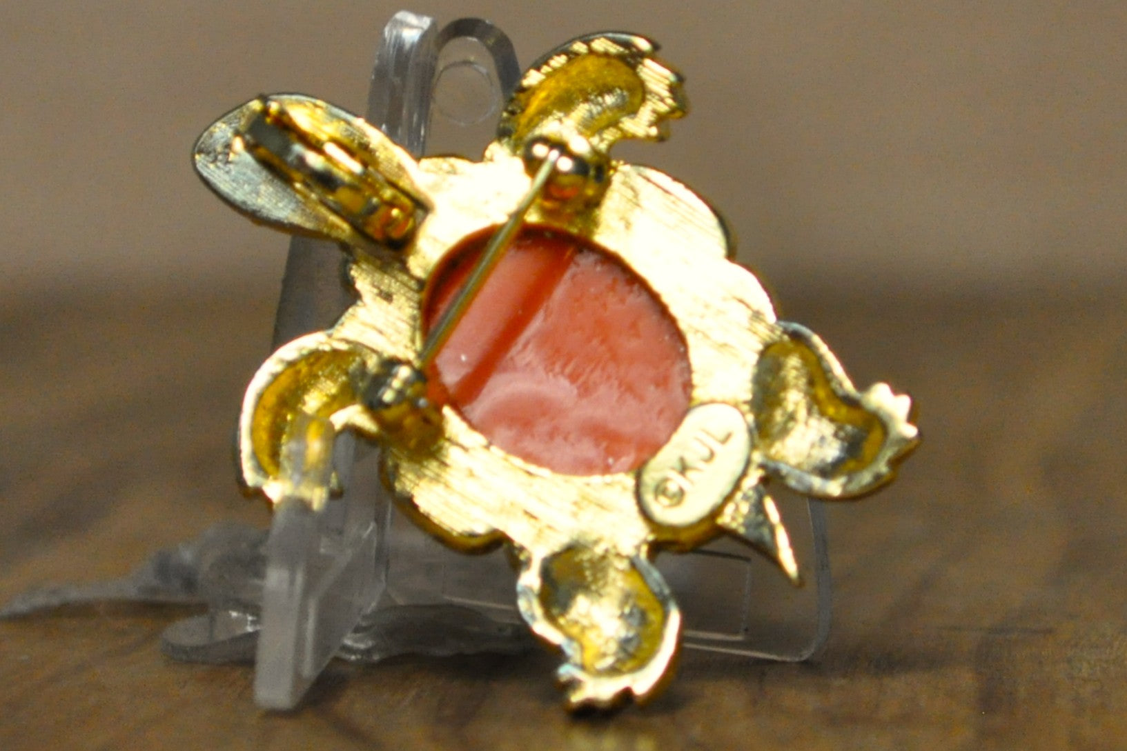 Kenneth Jay Lane Coral Turtle Brooch - Signed KJL - Gold Tone Coral Shell Turtle Brooch - Retired KJL