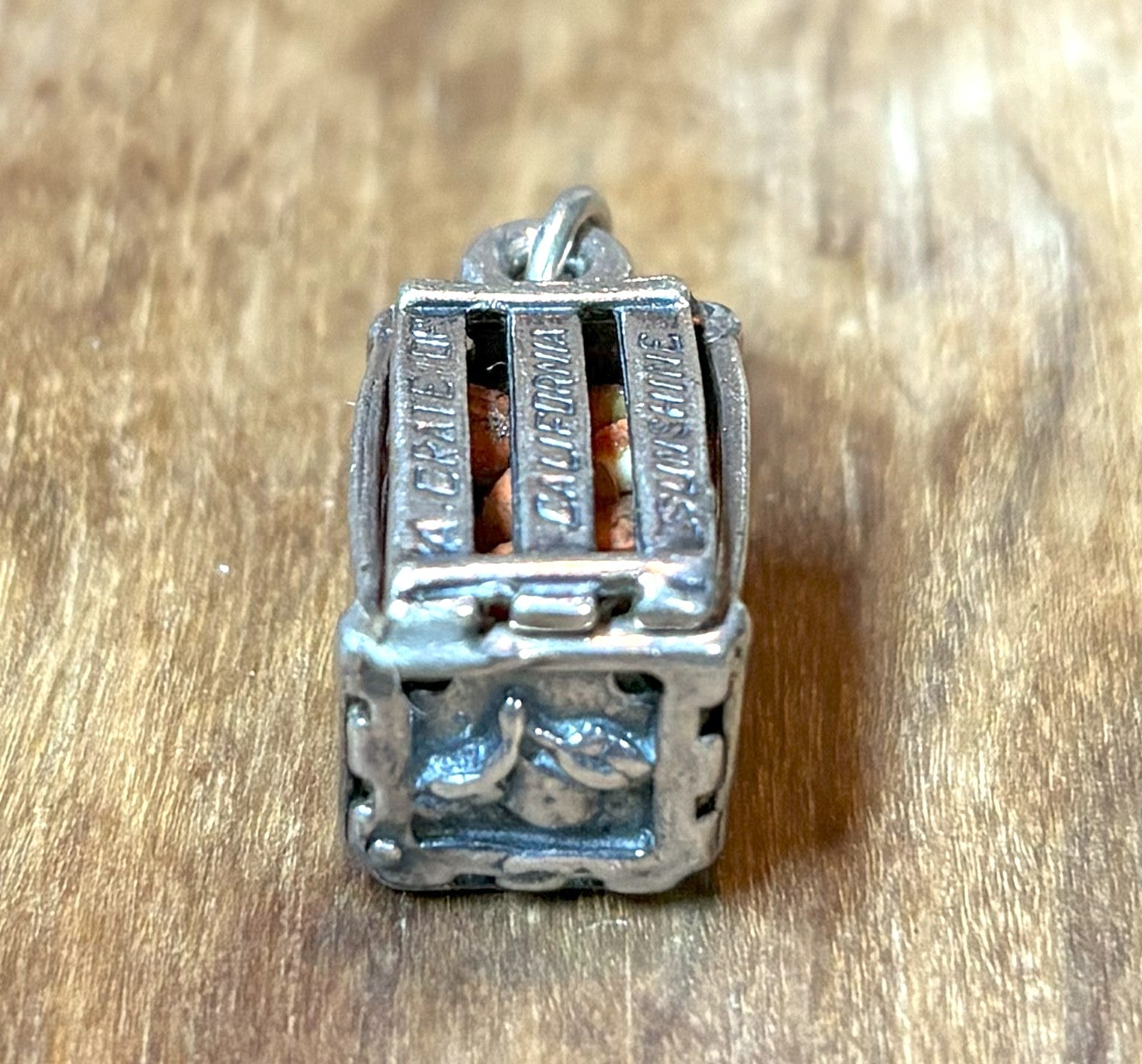 This listing is for the "Crate of California Sunshine" Sterling Silver Charm with Miniature Oranges. This charming vintage souvenir is crafted from polished sterling silver and modeled after a miniature slatted fruit crate. The front of the piece features the engraved phrase A Crate of California Sunshine, while the other sides are detailed with the names of famous California cities like Hollywood, San Francisco, and Los Angeles. Inside the open-work silver cage, you will find several small, hand-formed orange-colored beads that represent individual oranges. These tiny citrus pieces are loose inside the crate, allowing them to move and rattle slightly when the charm is handled. The top is finished with a sturdy silver jump ring, making it ready to be added to a classic charm bracelet or worn as a unique pendant on a necklace. Adorable Find!