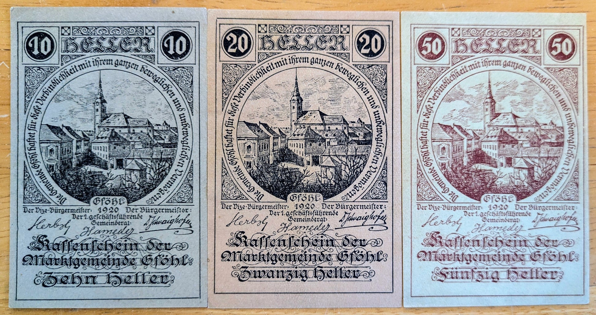 1920 Gfohl Austria 10, 20, 50 Heller Notgeld Complete Set - WWI Austrian Notgeld - 1920 Austria Emergency Note Full Denomination Set