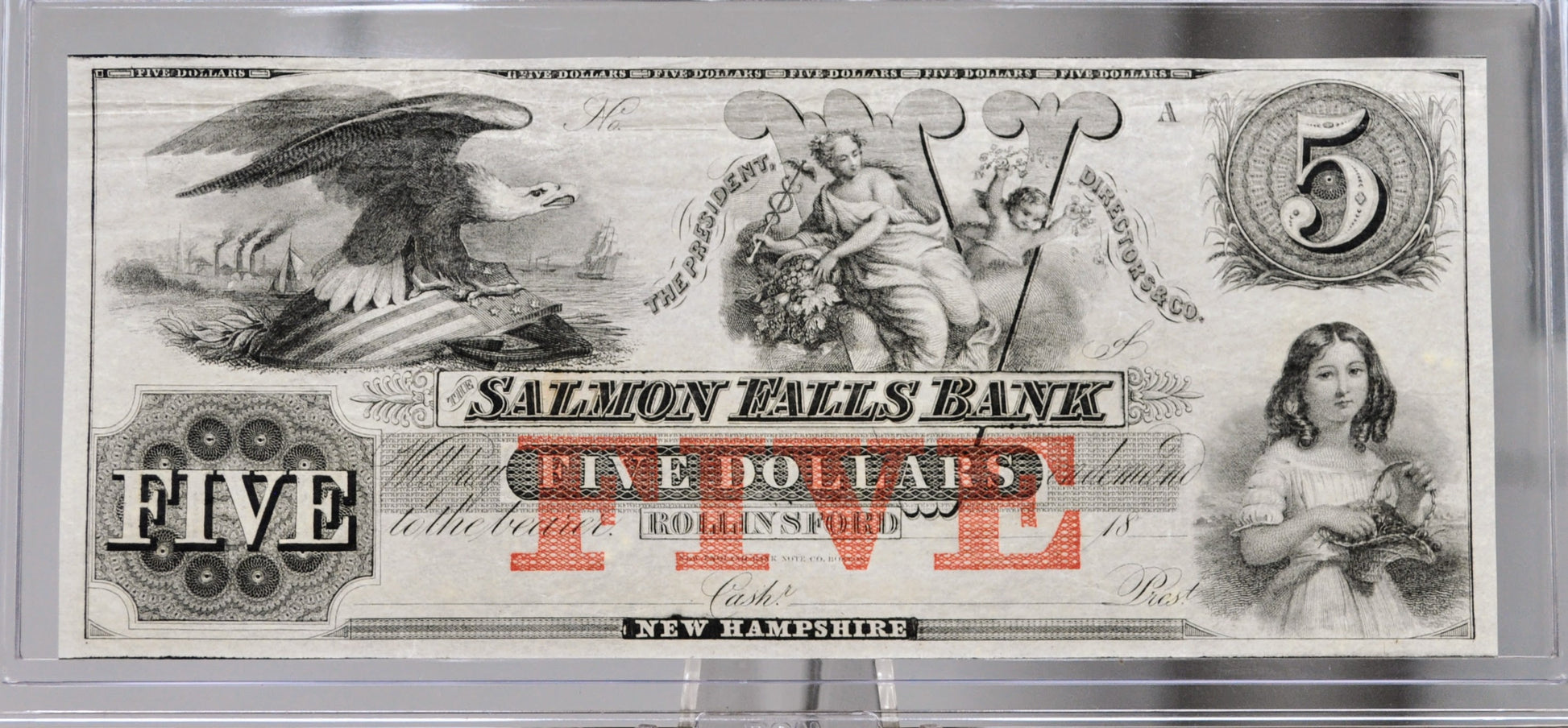 This listing is for the photographed 1800s Unissued Salmon Falls Bank 5 Dollar NH Obsolete Remainder Note. The vignettes on the obverse of this note are a perched bald eagle on a patriotic shield and anchor with ships and a factory in the background on the left end, an allegorical woman representing commerce holding a caduceus and a basket along with a cherub at the center, and a girl holding a basket displayed in the bottom right end of the note. Beautiful clear designs! Uncirculated (UNC) crisp grade/condition, no signs of circulation and wear from age! We are based in New Hampshire and are always looking for any NH items with historical significance. So we were very excited to find this one!