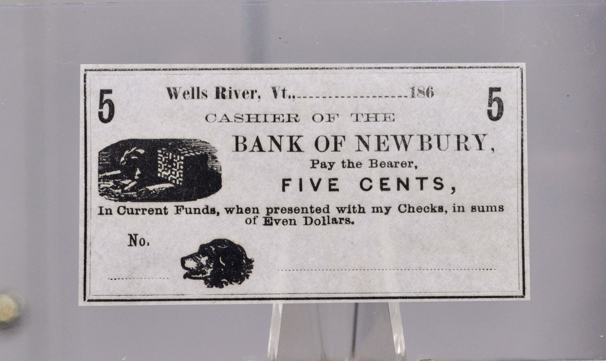 This listing is for the photographed 1860s Bank of Newbury 5 Cent Unissued Merchant Scrip Remainder Note. Printed in Wells River, Vermont. Vignette of a sleeping dog next to a safe and holding a key on the left end, the head of a dog is displayed at the bottom of the note. This note was unissued, as identified by its lack of a signature, date, and serial number. Crisp Uncirculated (UNC) grade/condition, no signs of circulation! Great find with an incredibly interesting history!