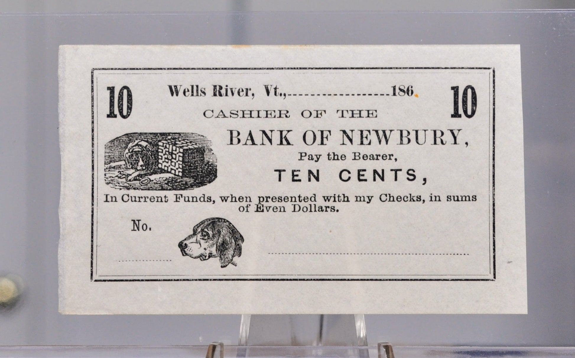This listing is for the photographed 1860s Bank of Newbury 10 Cent Unissued Merchant Scrip Remainder Note. Printed in Wells River, Vermont. Vignette of a sleeping dog next to a safe and holding a key on the left end, the head of a beagle is displayed at the bottom of the note. This note was unissued, as identified by its lack of a signature, date, and serial number. Crisp Uncirculated (UNC) grade/condition, no signs of circulation! Great find with an incredibly interesting history!