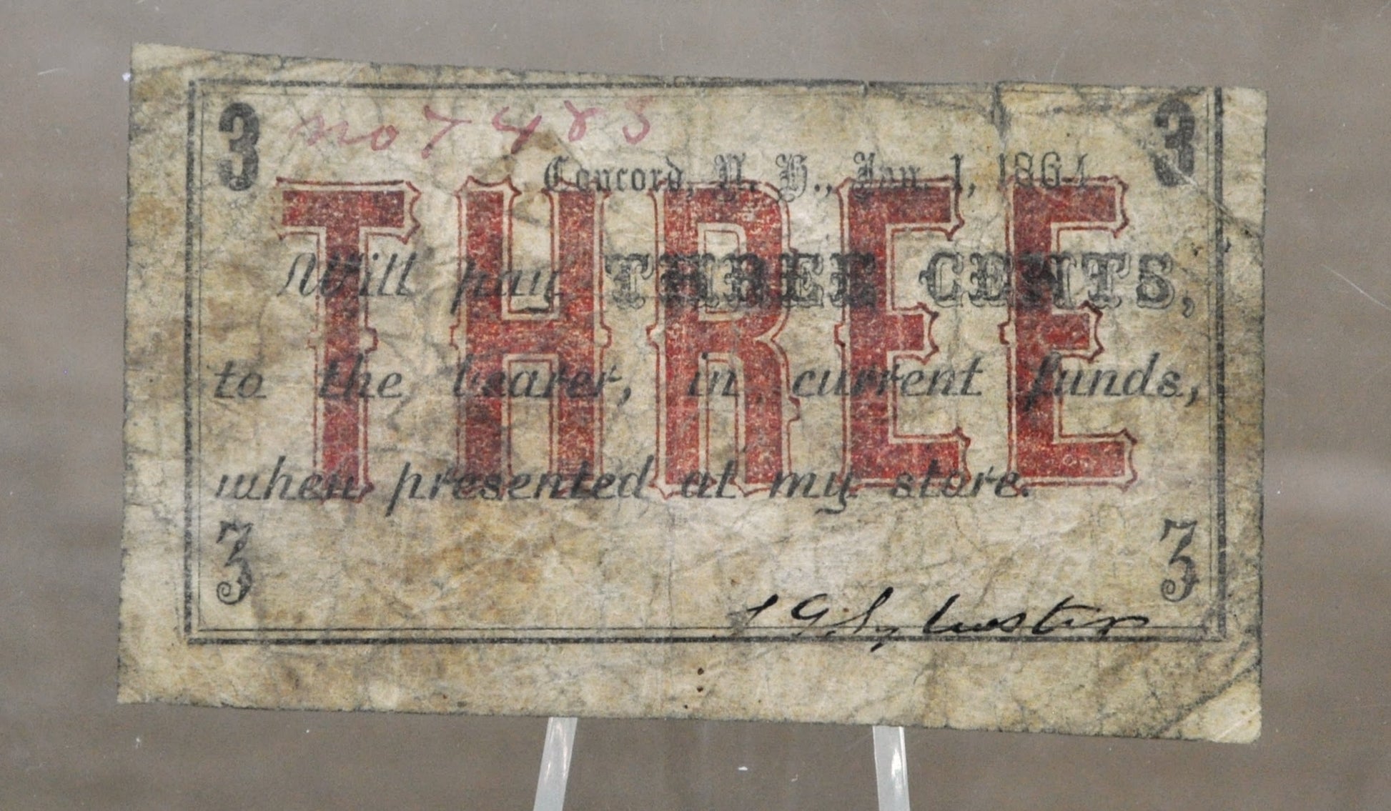 1864 Concord NH S. G. Sylvester 3 Cents Scrip - Uppercase Three Type - Rare Civil War Era New Hampshire Obsolete Three Cent Store Note