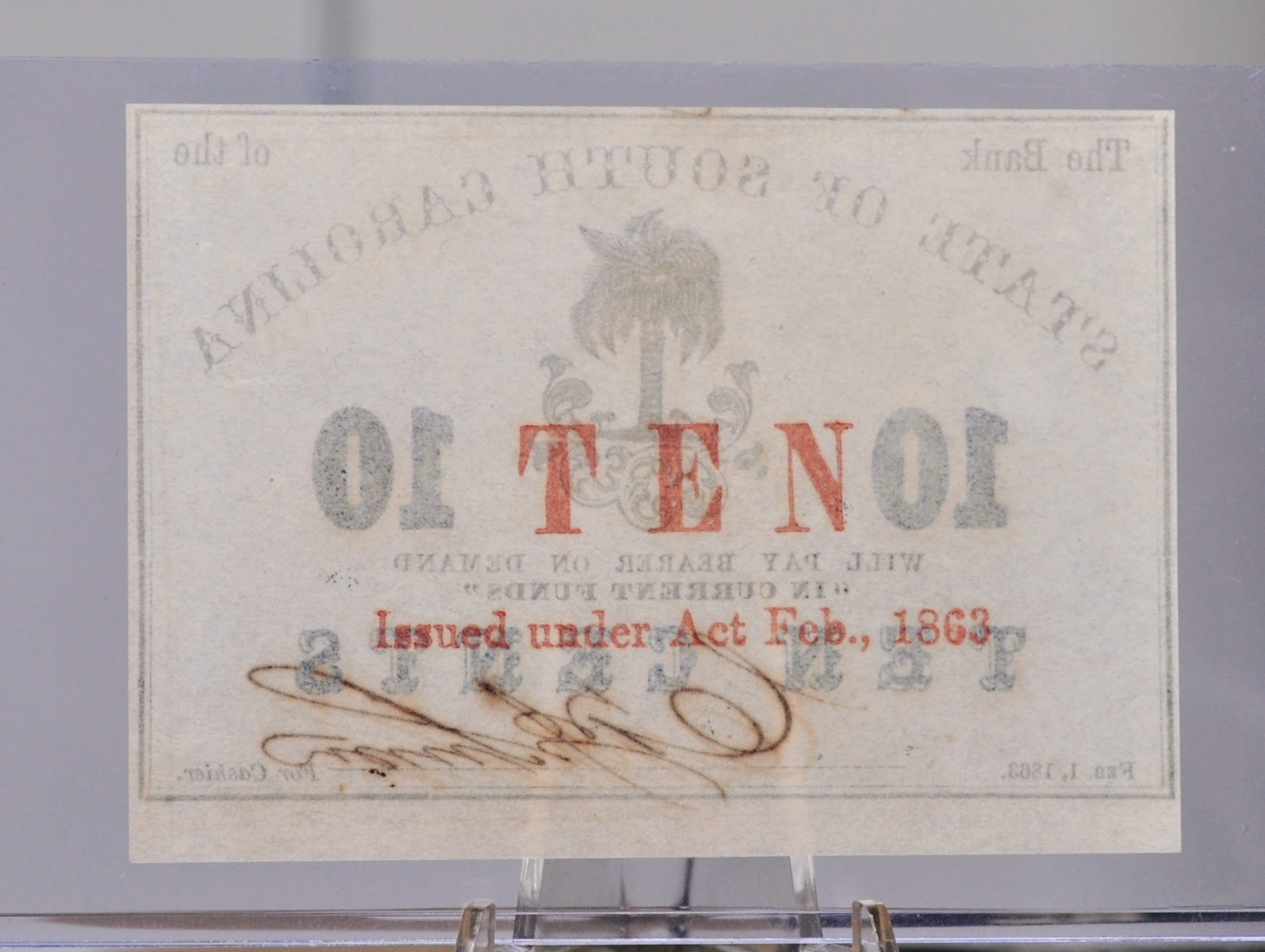 This listing is for the photographed 1863 State of South Carolina 10 Cents Obsolete Banknote. Reverse of the note says that it was issued under the Act of February 1863. Dated February 1st, 1863. Hand signed and issued note. Uncirculated (UNC) grade/condition, excellent crisp note! Center vignette of the South Carolina state symbol, a palm tree. Confederate issued currency, great piece of history. Must have for any collection!