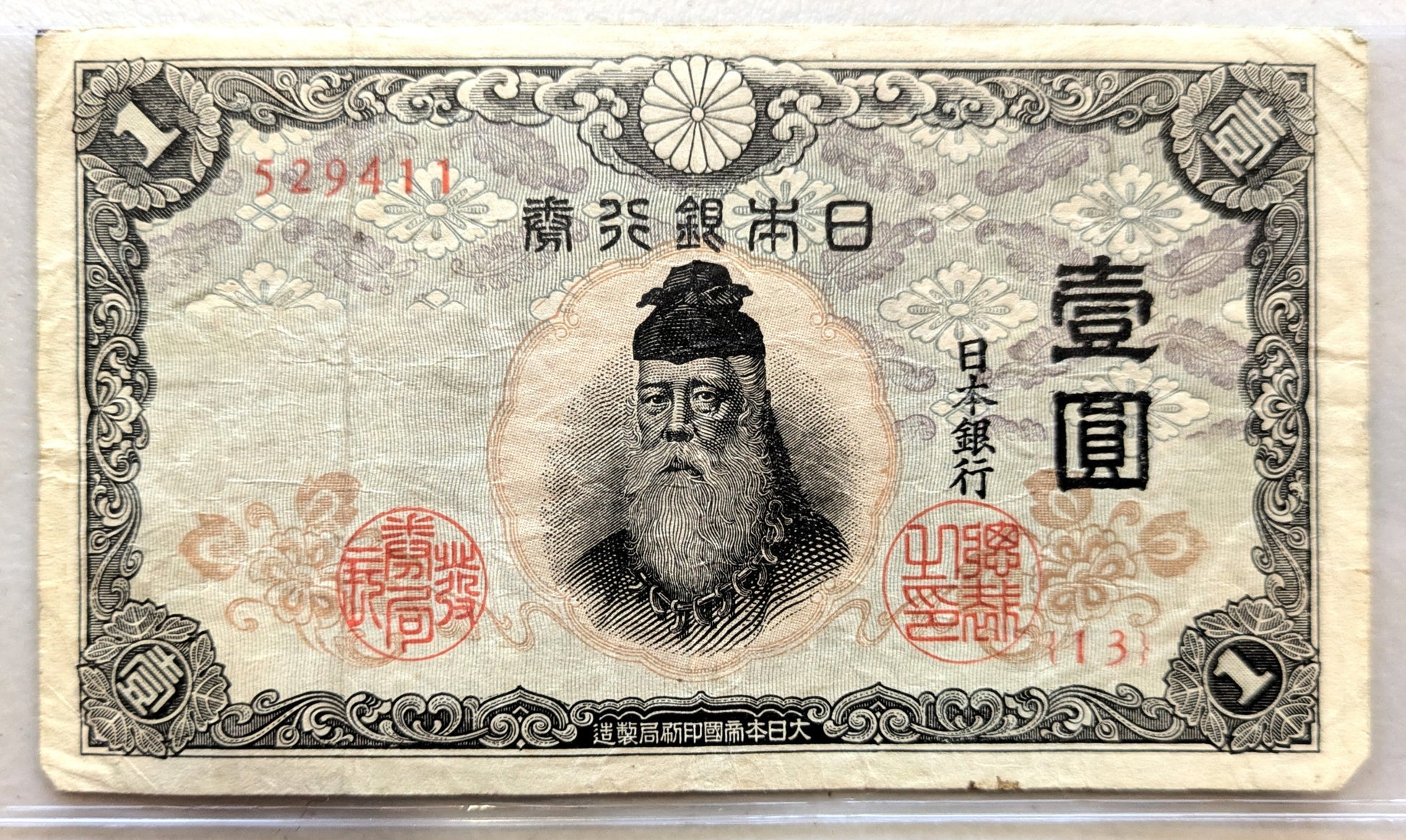 1943 Bank of Japan 1 Yen Banknote - World War II Japanese Note - Serial and Block Number Note - 1943 Japanese One Yen Note - P#49a