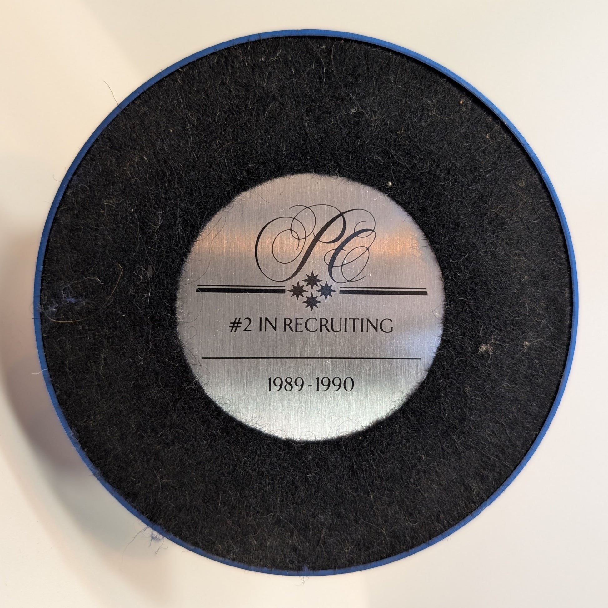 This award was given out during the Avon Presidents Club Awards. The figurine is the #2 award in recruiting in the district for the 1989-1990 sales year.