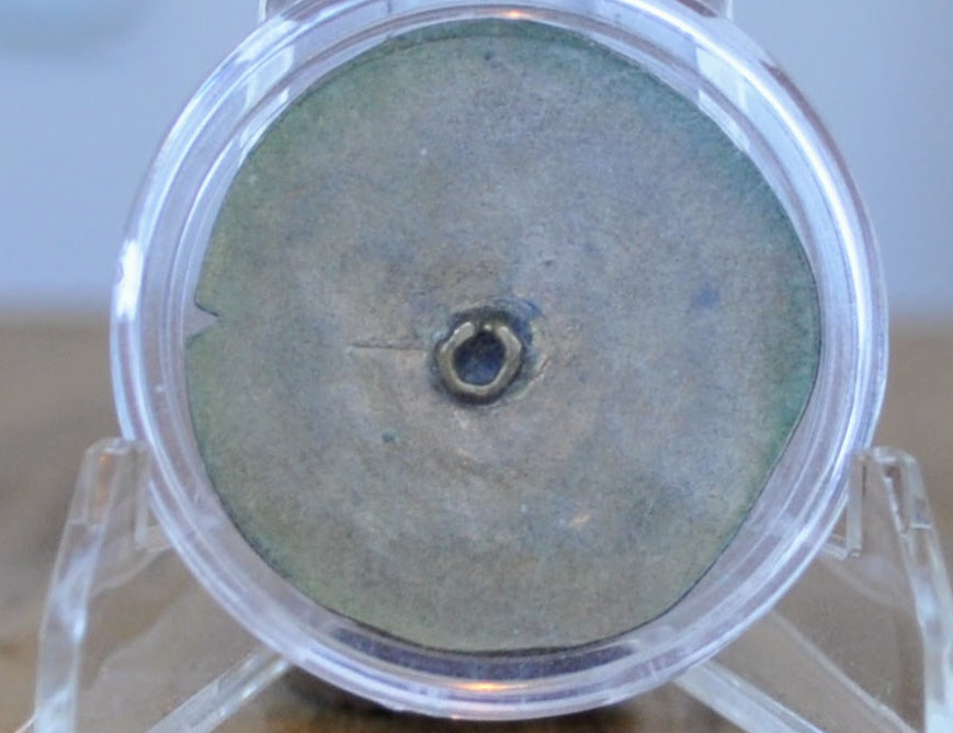 This listing is for a Military-Style Button from 1560. On the front, it depicts a heraldic shield topped with a crown, and inside the shield are three Fleur-de-lis arranged vertically. The crown indicates nobility/monarchy used in official emblems. This shield is an elemental representation of defense/protection. The Fleur-De-lis within the shield is historically associated with French royalty. Great find!