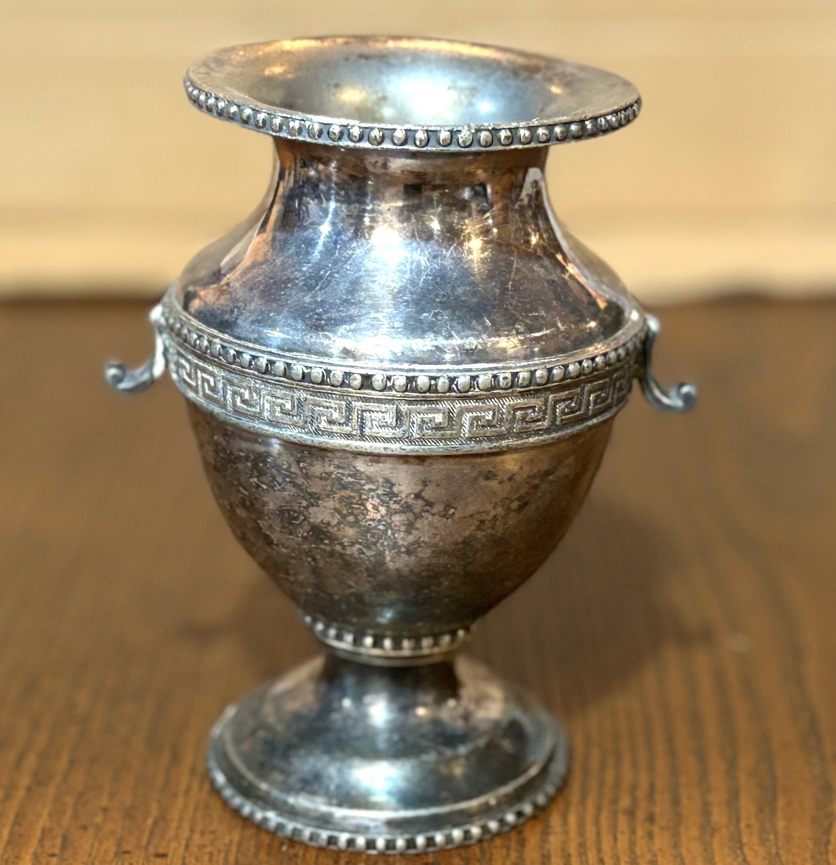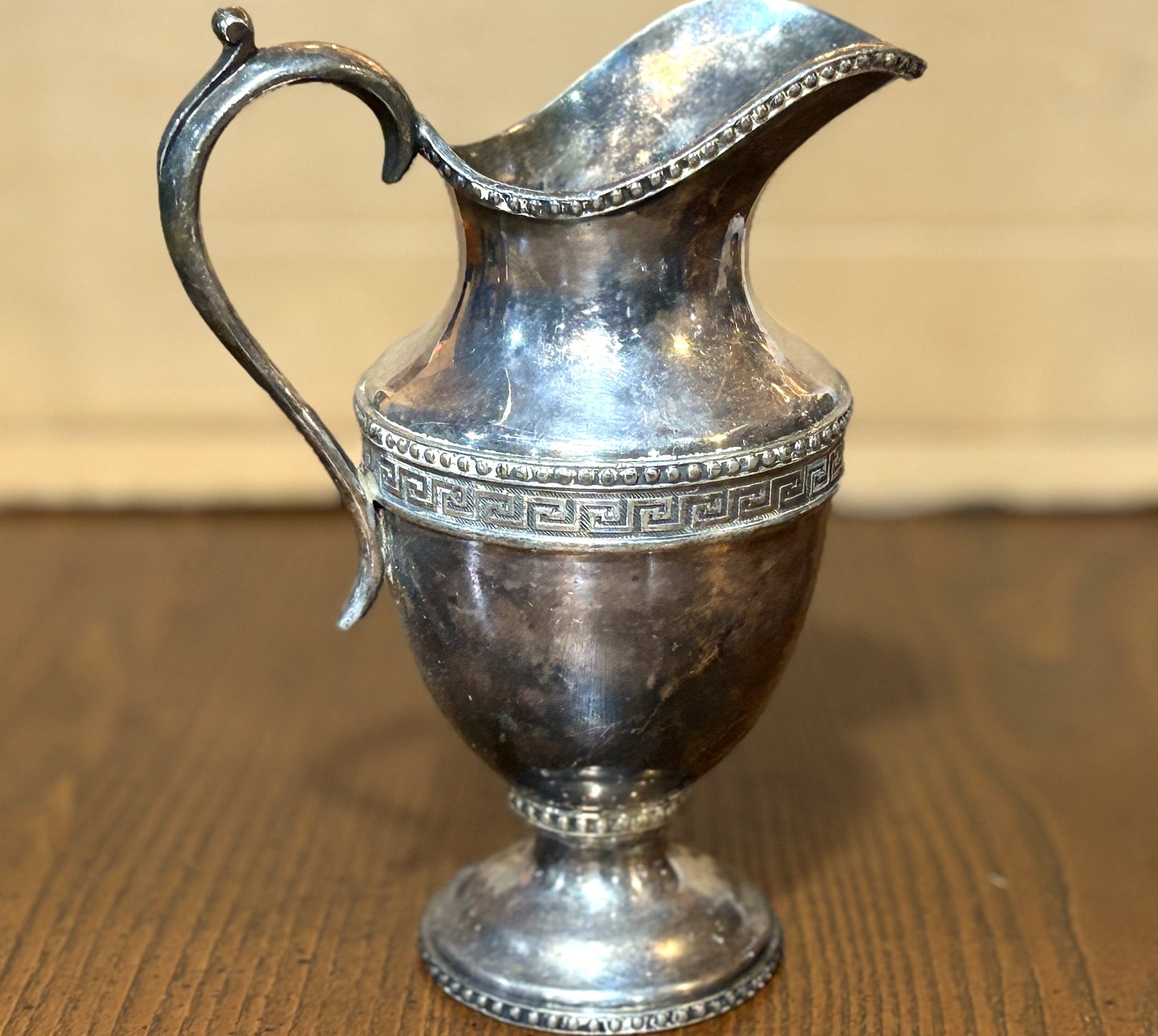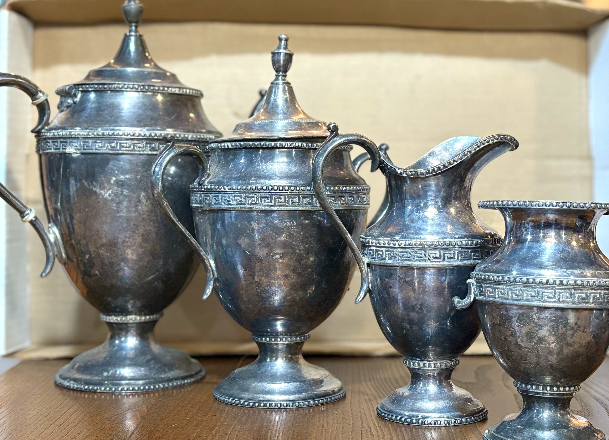 This listing is for a Four Piece Antique Tea Service Set, pattern 1790, Stamped. The set features a prominent Greek key band pattern around the body of each piece. The forms of the vessels draw from classical Greek precedents like the amphora and ewer. Great Find!!!