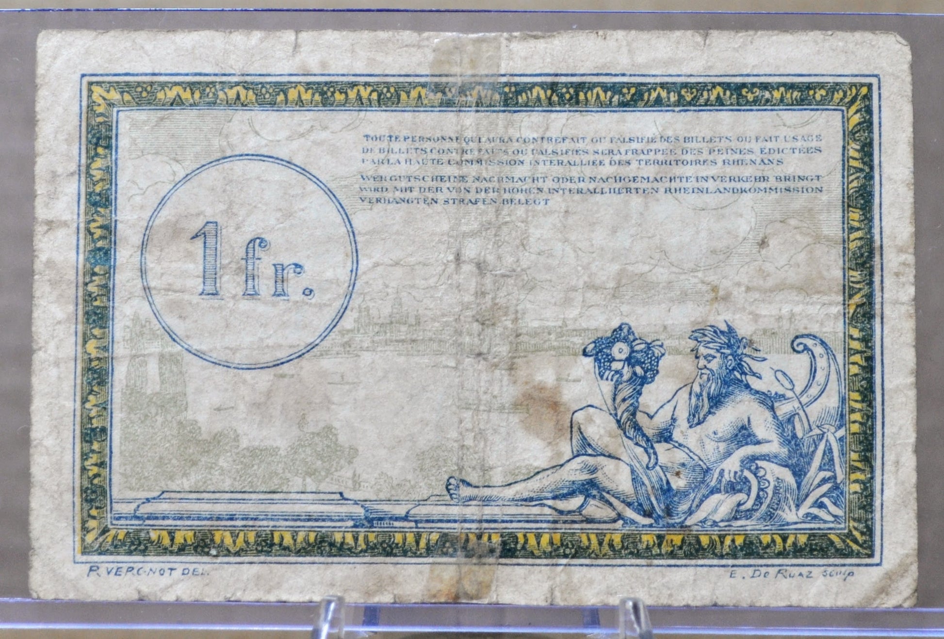This listing is for the photographed 1923 Regie des Chemins de Fer des Territoires Occupes (RCFTO) French Occupied Germany 1 Franc note. Issued by the RCFTO or railway authority in the occupied German territory of Saarland. The obverse of this note shows a train car at the upper center, and the underprint of a castle at the center with a floral border. The reverse of this note depicts a view of the city of Mainz in the background and the God Neptune laying down holding a cornucopia in the foreground on the right end. Very Fine (VF) grade/condition, some folds and other signs of circulation, minor tape reinforcements on the upper and lower center of the reverse. P#R5 (Pick Number R5). Fantastic piece of history in excellent condition. Rare French occupied Germany note!