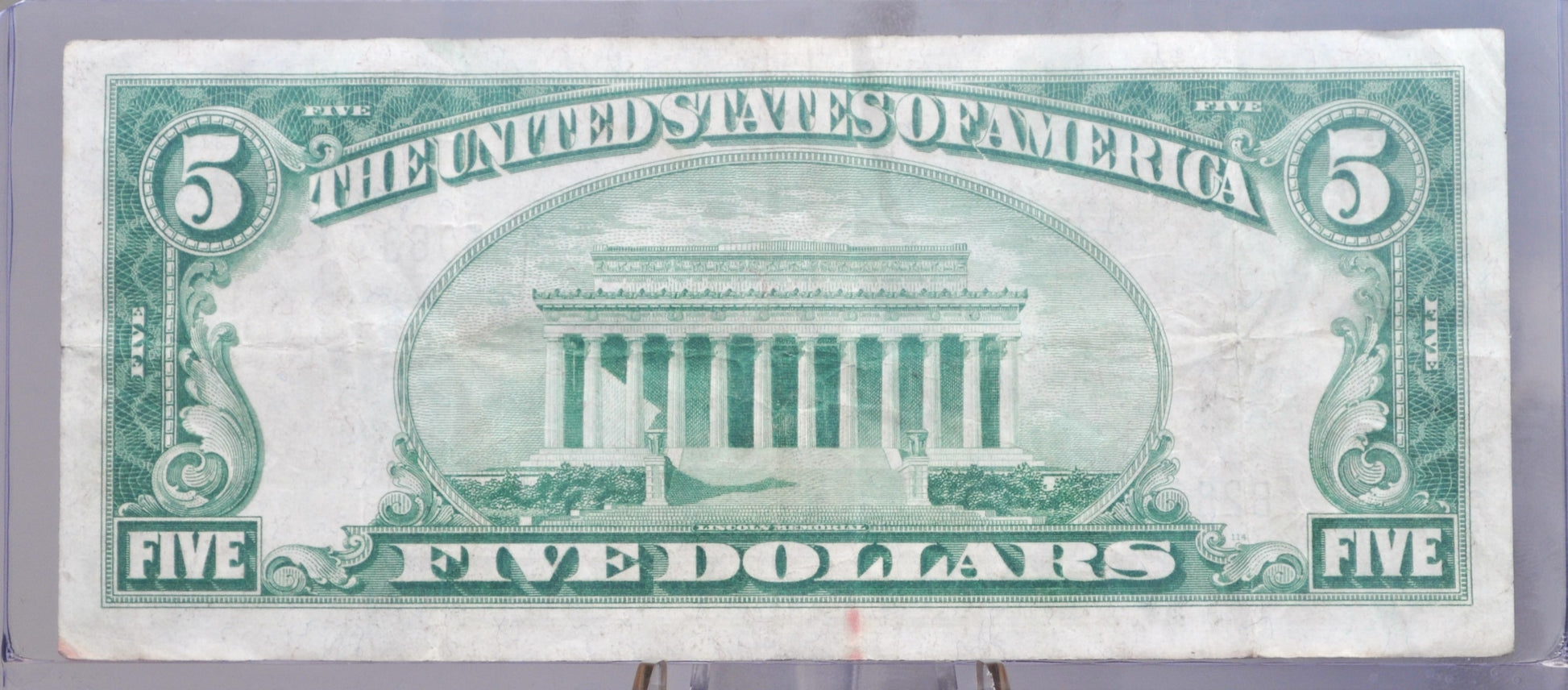 Under the Series of 1928, all small-sized notes carried a standardized design. All $5 bills would feature a portrait of Lincoln, the same border design on the obverse, and the Lincoln Memorial on the reverse. The $5 bill was issued as a United States Note with a red seal and serial numbers and as a Federal Reserve Note with a green seal and serial numbers.