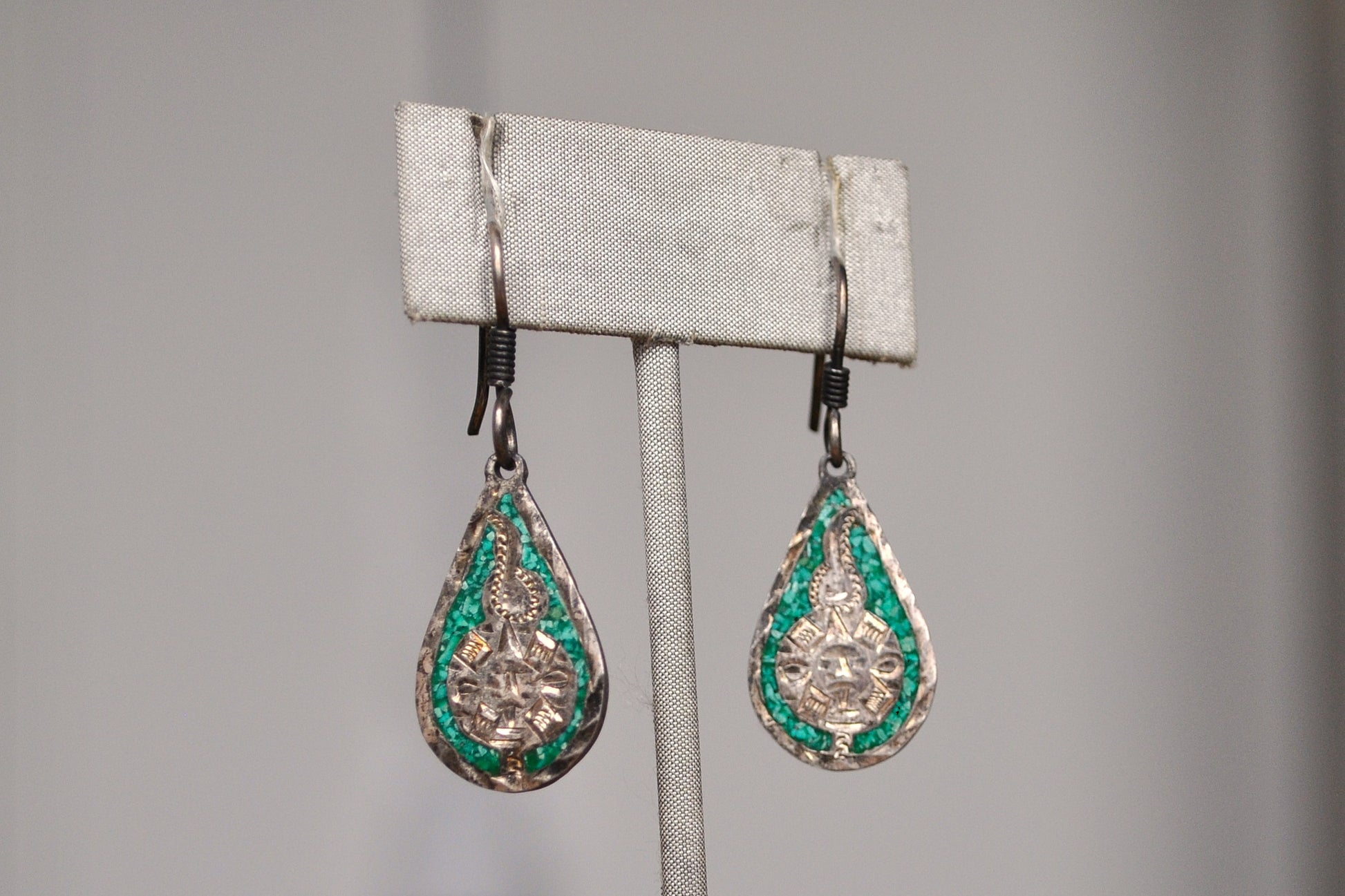 Antique Mexican Sterling Silver Malachite Mosaic Mayan Calendar Dangle Teardrop Earrings - Mayan Calendar Earrings - Sundial Earrings