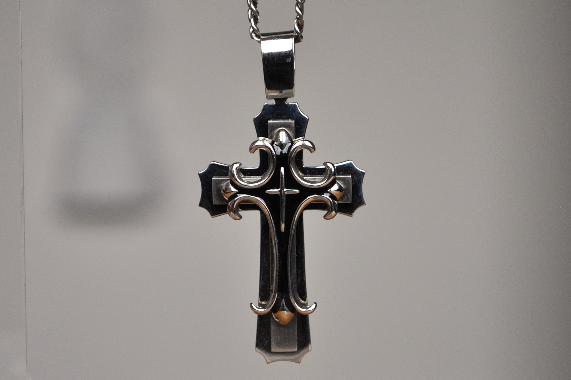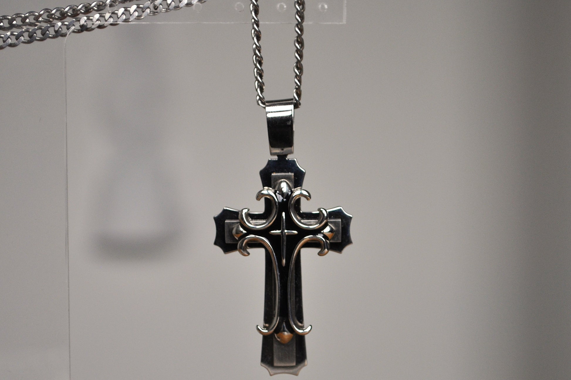 This listing is for the photographed Chunky Crucible Stainless Steel Crucifix Biker Necklace. Very chunky crucifix pendant necklace made of stainless steel with a lot of flair coming off the sides of the pendant.
