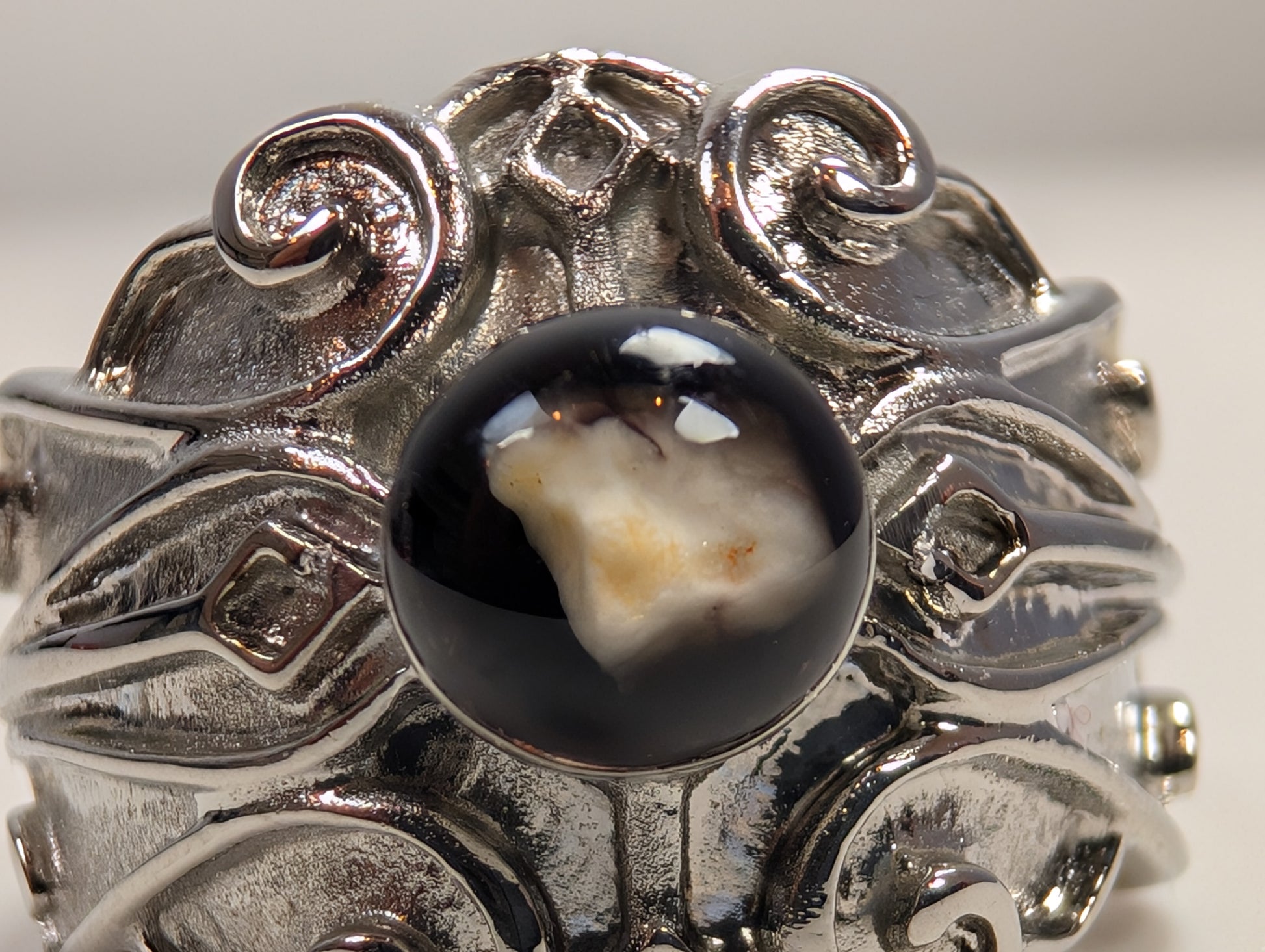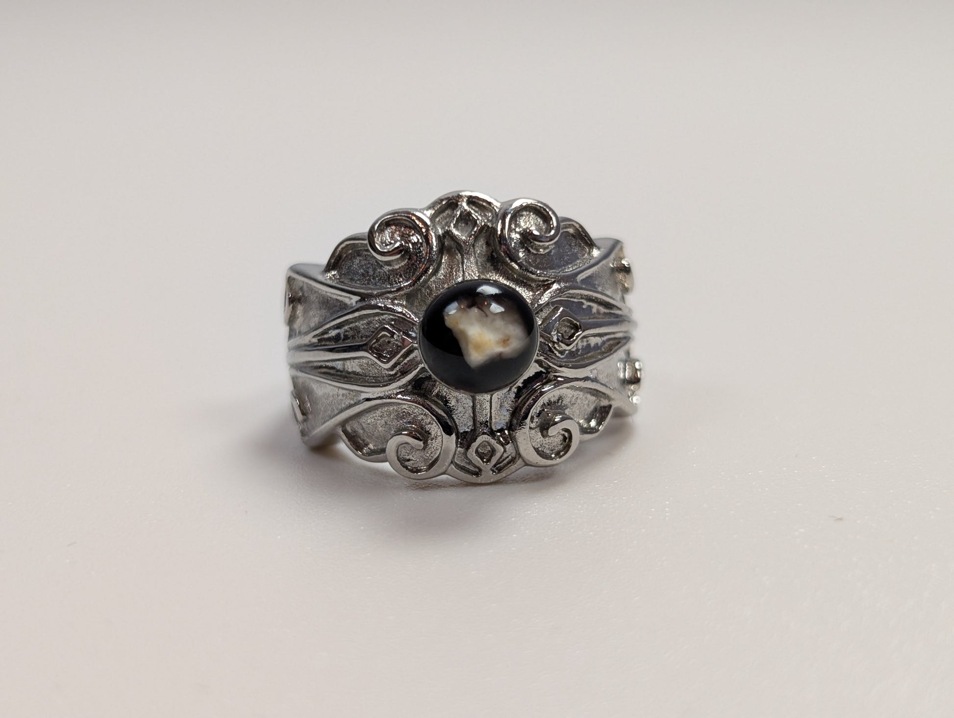This listing is for the photographed Stunning Michael Anthony Nativity Stone Ring - Size 6. Beautiful ring featuring a nativity stone in the center atop the dome of the ring, made by renown jewelry designer Michael Anthony. The nativity stone in the center is held in a clear onyx black opening that only allows the stone to be seen. Aside the stone there is a French twirling line design that leads into the shoulders of the ring.
