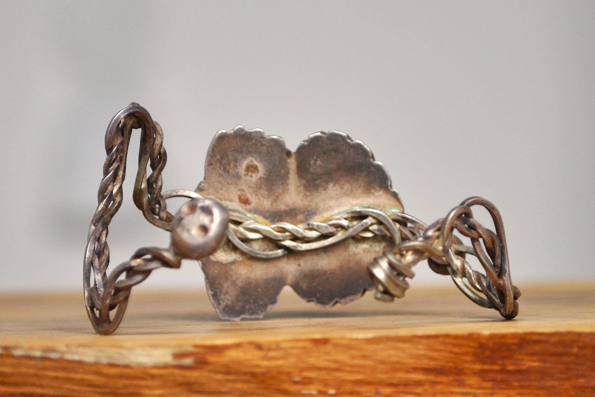 This listing is for the photographed Homemade Edged Dome Coiled Wire Turquoise Bracelet. This unique homemade bracelet contains 2 turquoise stones held in a jagged dome with a coiled wire creating the cuff. The Navajo believed turquoise was a sacred stone used for protection from evil, good fortune, and health. The turquoise blue is very special in Navajo culture resembling the sky and water. The bracelet has a height of 1.5 inches and a width of 2.5 inches.