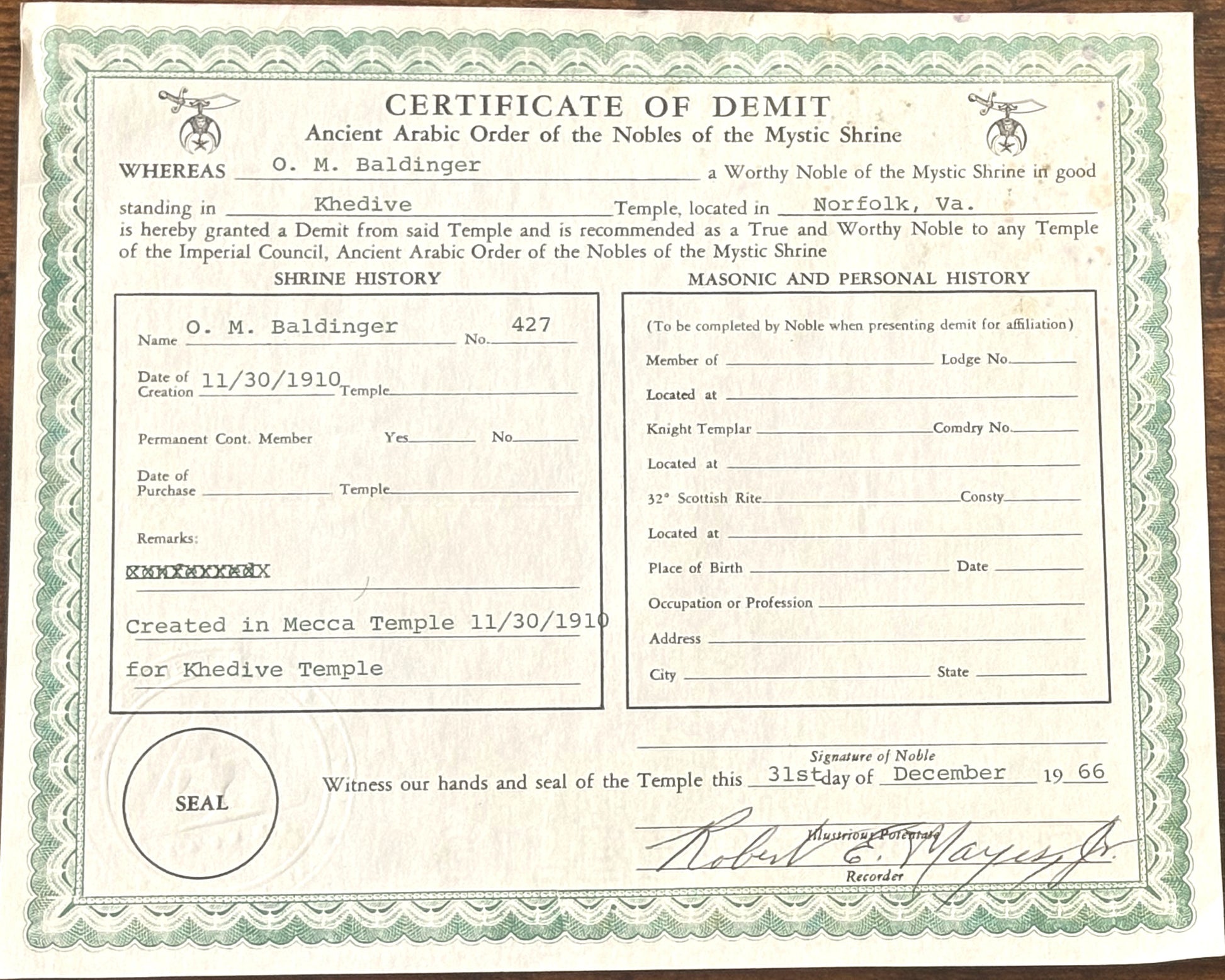 This listing includes Ora M. Baldinger Membership certificates, a lot of four. The first certificate is from the Order of the Eastern Star, Virginia Chapter, No. 22, O.E.S. The second certificate is a demit from the Ancient Arabic Order of the Nobles of the Mystic Shrine. The third certificate comes from Stevenson Commandery No. 8, and the last certificate is from the Khedive Temple, thanking Ora Mathias Baldinger for being their longest continuous member.