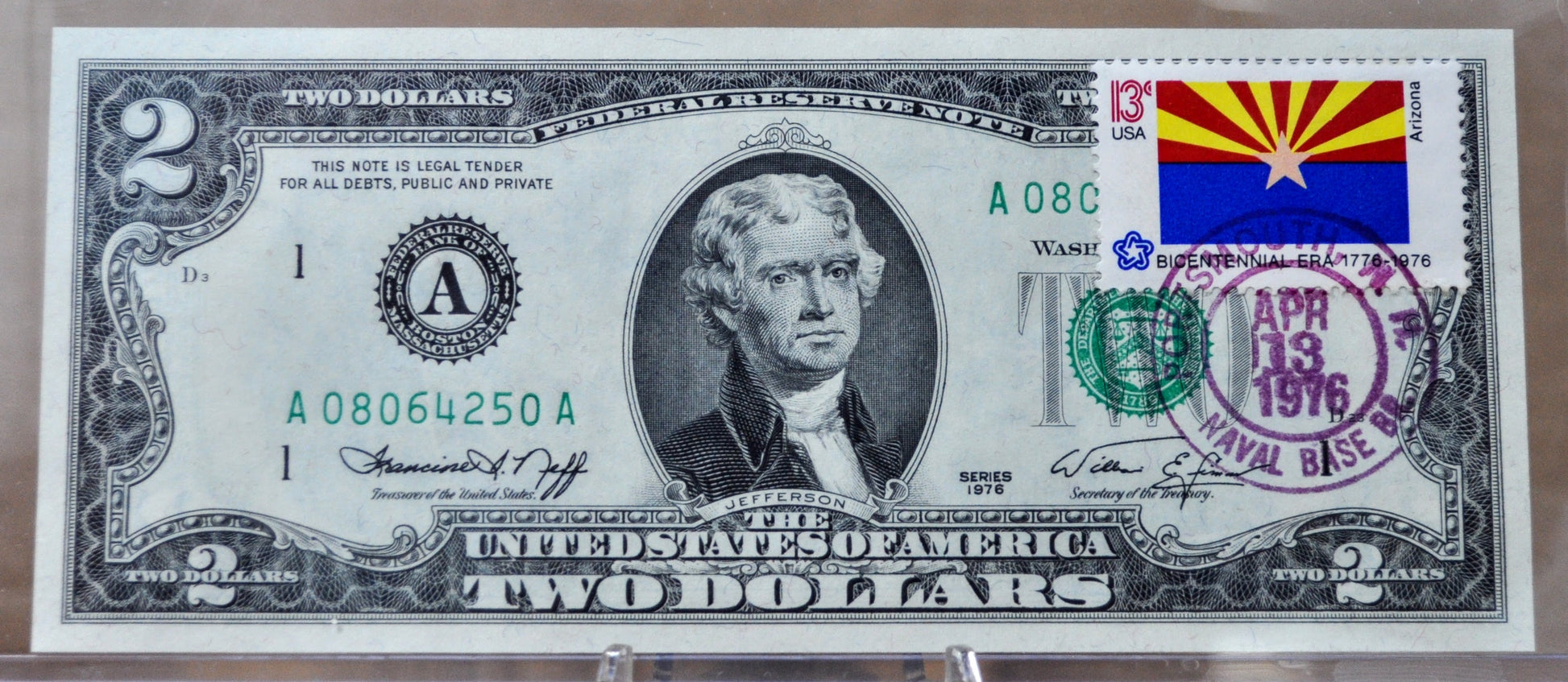 This listing is for the photographed 1976 Bicentennial Federal Reserve 2 Dollar Note with a First Day of Issue Arizona State Flag Stamp. Note was printed at the Federal Reserve Bank in Boston, MA; "A" Issue. The note includes a 13c Bicentennial Era stamp that features the Arizona State Flag, as well as a purple ink stamp that identifies that it was issued on the first day of issue, April 13, 1976, at the Naval Base in Portsmouth NH. Uncirculated (UNC) grade/condition, no signs of circulation. Incredibly interesting commemorative bicentennial note, perfect collector's item or gift! Great addition to any collection!