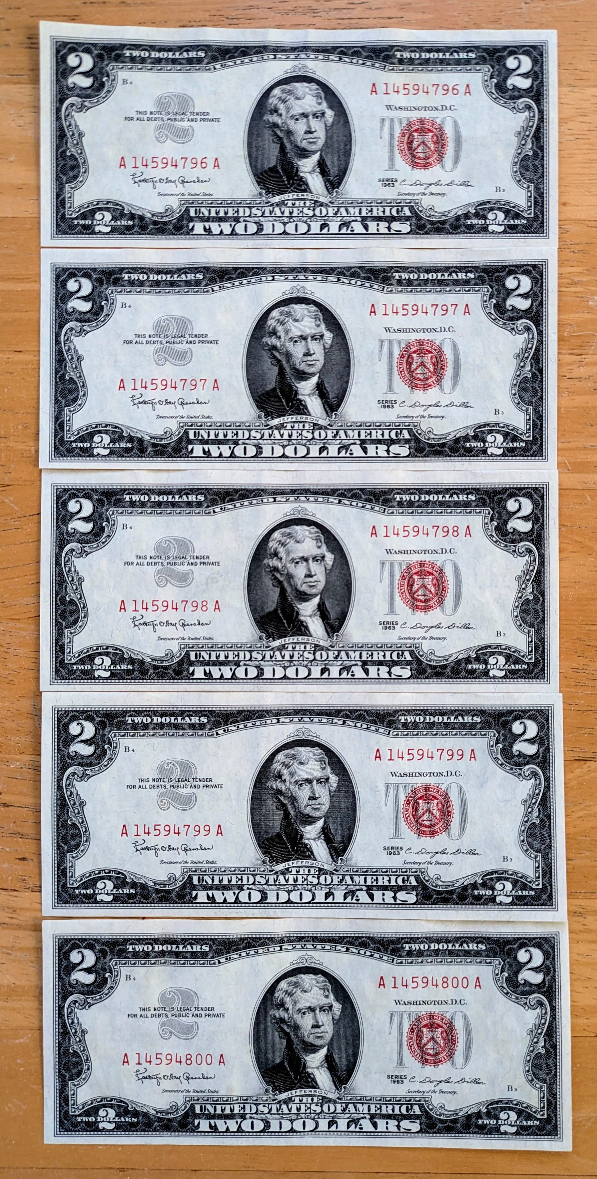 This listing is for the photographed Consecutive Serial 1963 2 Dollar Legal Tender Notes Set of 5. Notes have consecutive serial numbers, 14594796 to 14594800. All notes are in excellent, uncirculated (UNC) grade/condition. Amazing find and perfect addition to any collection! Fr#1513 (Friedburg Number 1513).