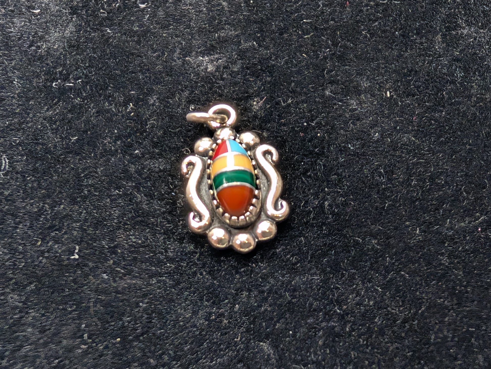Rare Small Sterling Silver Native Southwest Turquoise & Coral Chip Inlay Pendant - Stamped and Tested Sterling Silver - Elongated Scroll - Wheeler Manufacturing