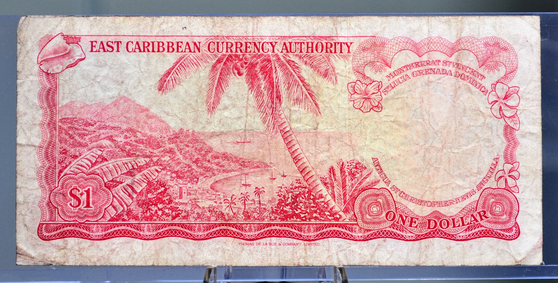 In 1965 the East Caribbean Currency Authority was established to issue and manage a common currency for the East Caribbean States; the Leeward Islands, Winward Islands, Barbados and later Grenada in 1968. In 1974 Barbados removed its membership to the East Caribbean States, removing it from the ECCA issued notes after that date. Because of the multiple changes to ECCA during its operation, there are many variations of this note, including different signatures and displays. This note has both Grenada and Barbados listed on its map, meaning it was issued between 1968 and 1974.