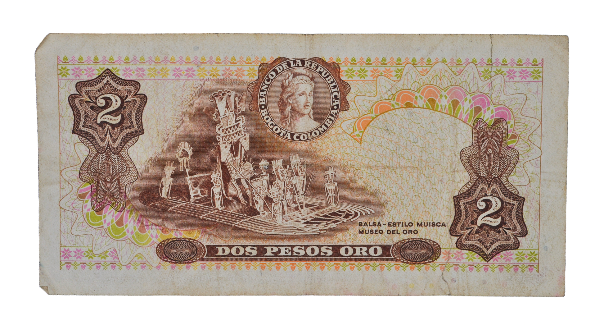 1973 Colombia 2 Peso Oro Note - Large Serial Numbers - 1973 Colombian Banco de la Republica Two Pesos Oro Banknote - P#413a