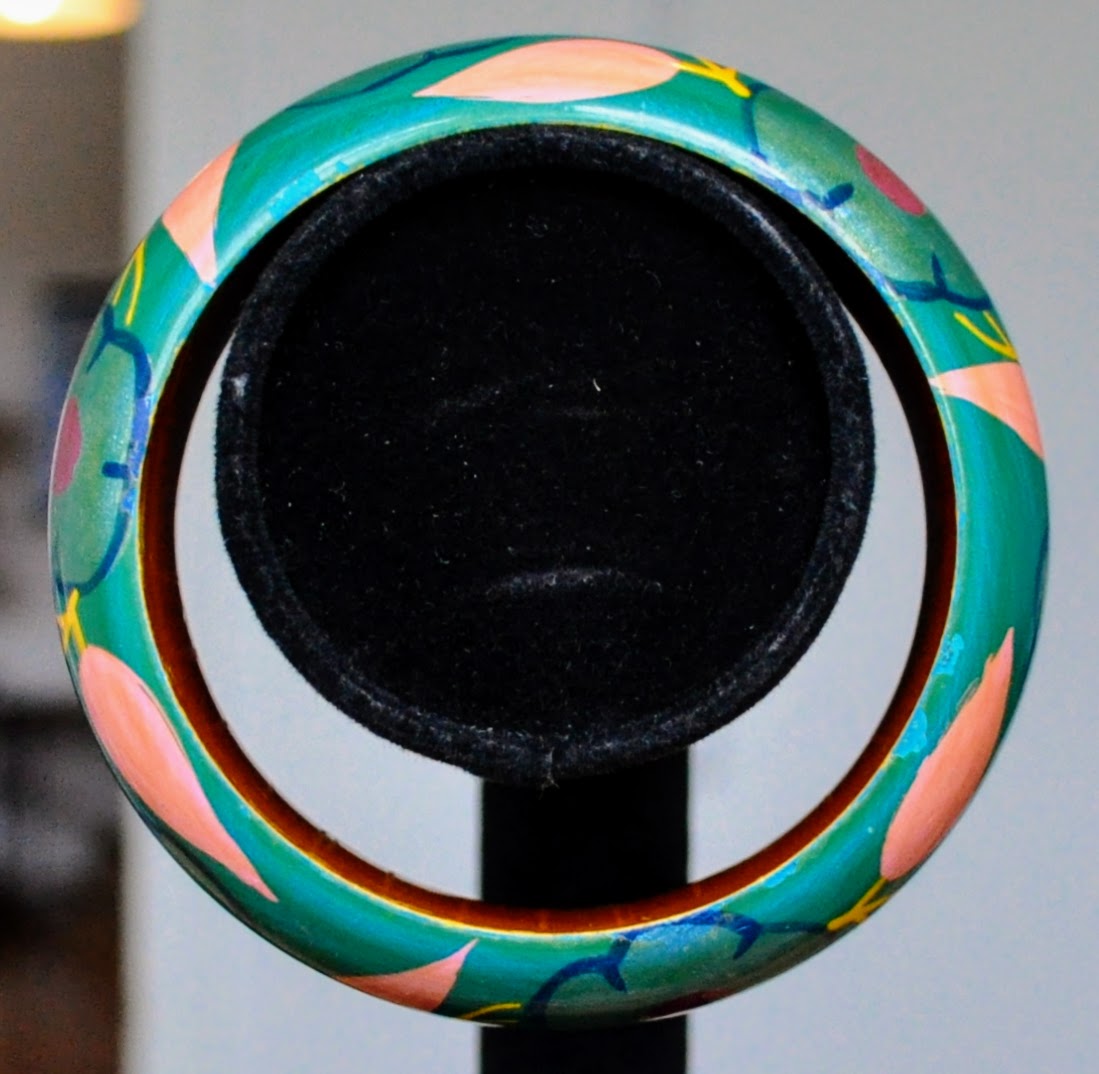 This listing is for the photographed Vintage 1970s Genuine Floral Painted Lacquer Wooden Bangle Cuff. Bracelets inside width measures 2.5 inches. The bangle measures approximately 1 inch thick. The bracelet is made of wood that has been painted in a turquoise, pink, and orange floral pattern with lacquer that dates back to the 1970s. The small hairline fractures and orange tint seen on the inside of the bangle identify that the bangle was authentic to the 1970s, as this discoloration and wear is common with lacquer used during this time. Excellent boho and vintage find! Unique beautiful piece with lots of character, perfect addition to any collection!
