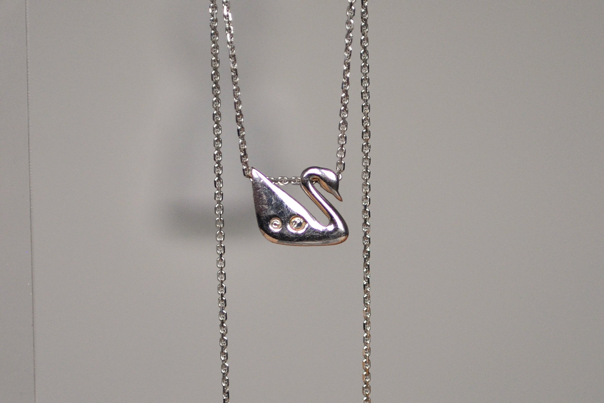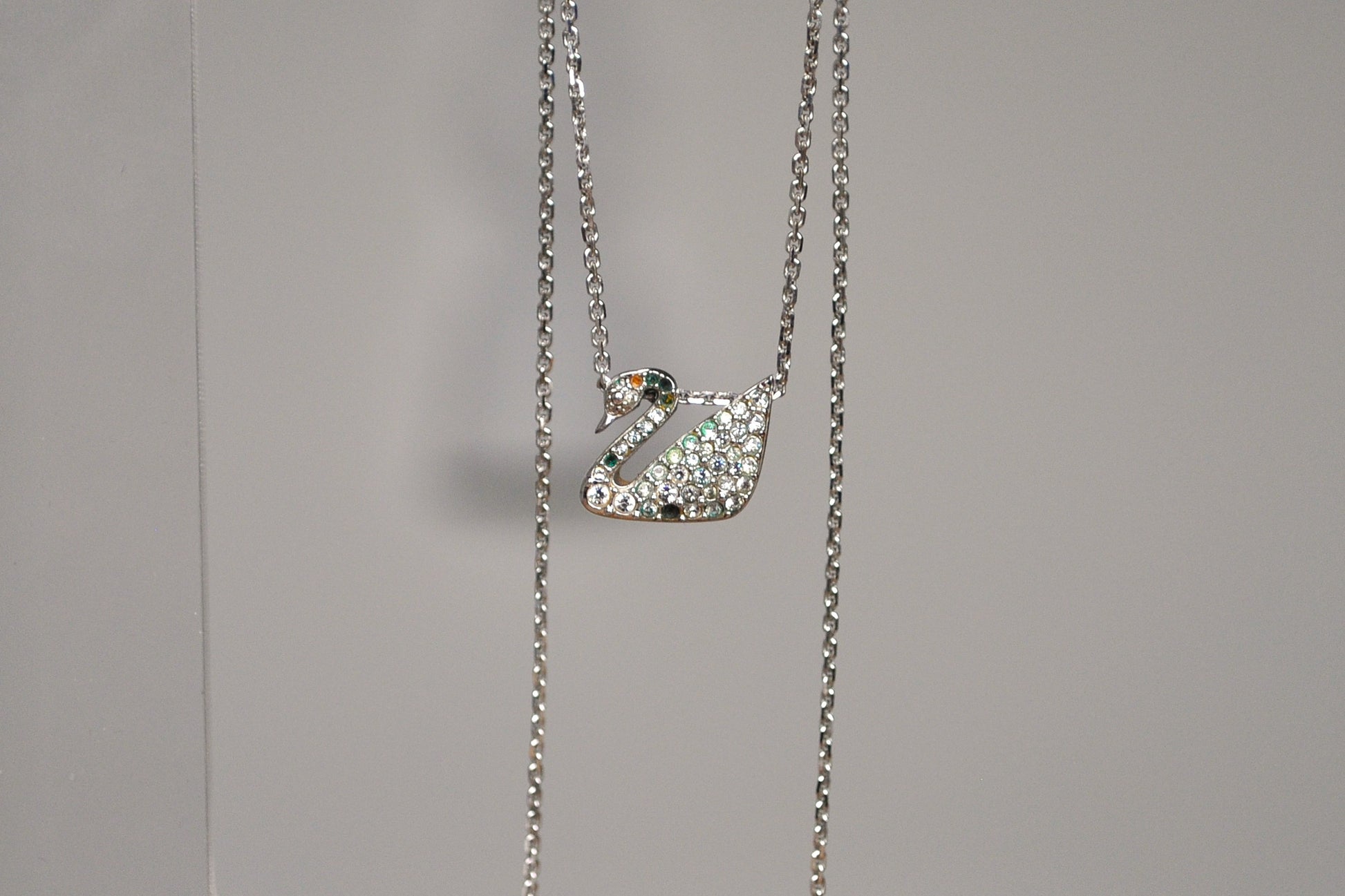 This listing is for the photographed Stunning Swarovski Crystal Swan Necklace - 20 Inches. Pretty Swarovski silverplated necklace filled with Swarovski crystals with a length of about 20 inches. This necklace is previously loved and has a few crystals missing resulting in a reduced price. Swarovski is engraved on the bottom of the pendant. Swarovski's history began in 1895 with Daniel Swarovski's invention of a precision grinding machine for crystal. This invention revolutionized crystal cutting, making it possible to create precisely shaped gemstones for jewelry and other products. Swarovski's expertise in glass processing also led to the production of optical devices like binoculars, and the company has expanded its product line over the years to include jewelry, accessories, and lighting.