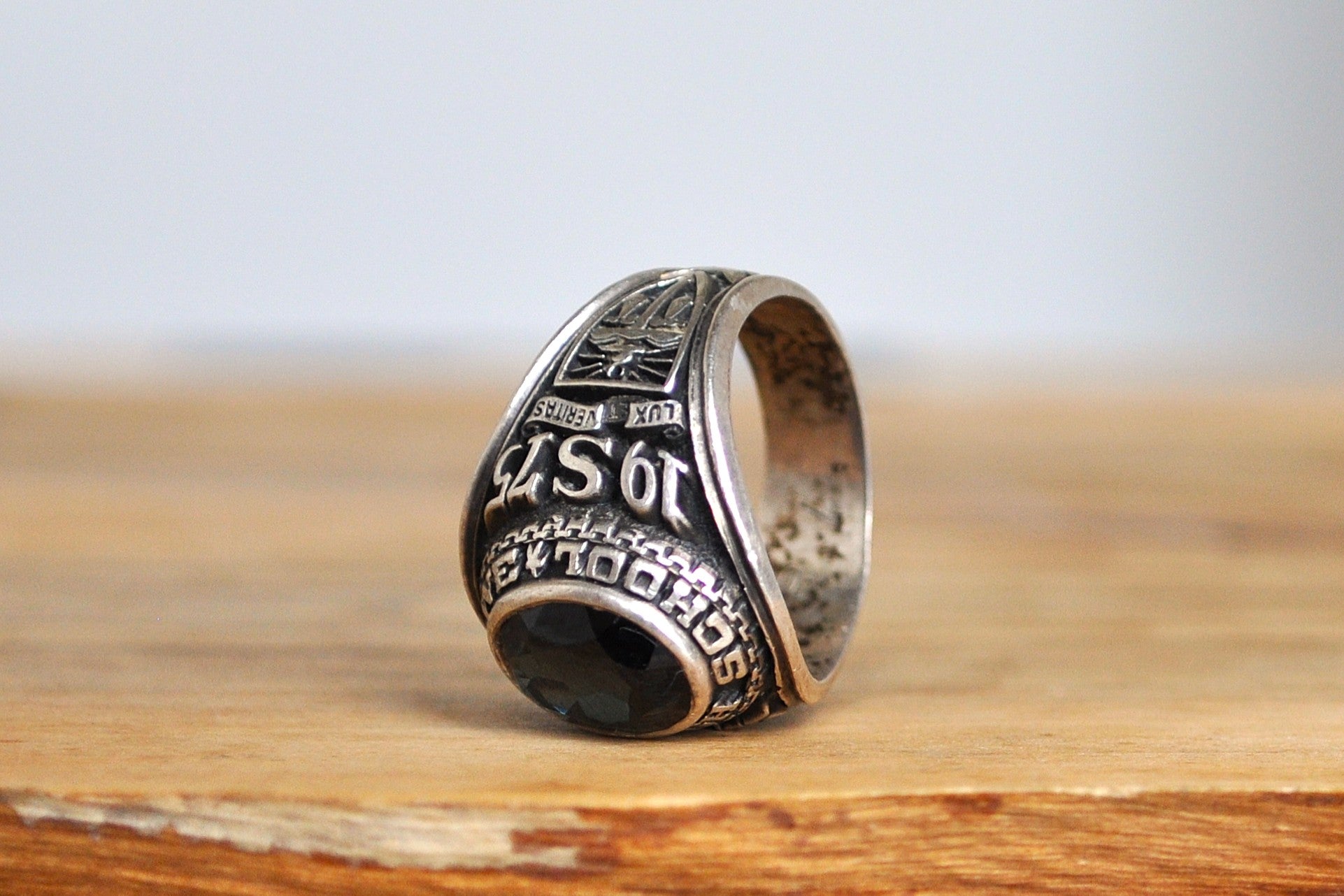 This listing is for the photographed Vintage 1975 Stowe High School Class Ring, Size 6.5. Beautiful class ring form 1975 for the graduates of high school in Stowe, Vermont, equipped with a emerald stone. Inscribed on the inside is "Balfour Sterling" and the initials "B.R.L.".