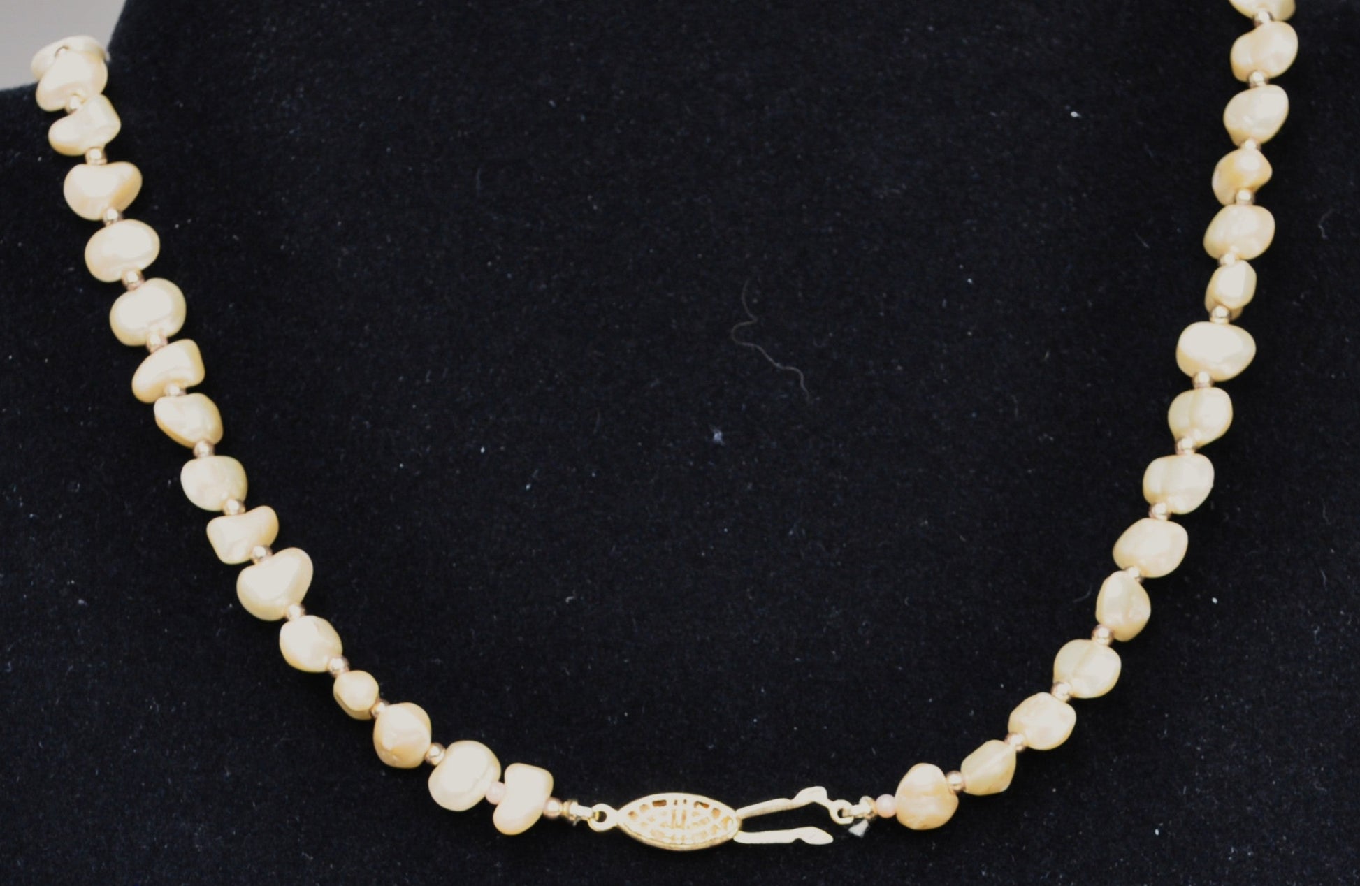 This listing is for the photographed Vintage G. Silver Gold Toned and Faux Pearl Clasp Necklace. Necklace measures 25 inches in total length. Signed "G. Silver" on the back of the necklace's clasp. Amazing unique freshwater type faux pearls separated by gold beads. The clasp is made of stunningly designed goldtone filigree, making for a vintage feel to the piece. Amazing piece from a great company! Perfect for both casual and formal wear!