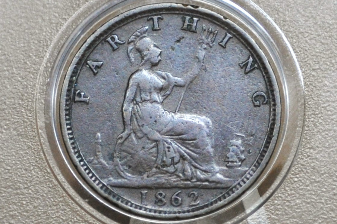 The first bronze farthings were struck in 1860, in the reign of Queen Victoria, with a new reverse designed by Leonard Charles Wyon. This shows a seated Britannia, holding a trident, with the word FARTHING above.