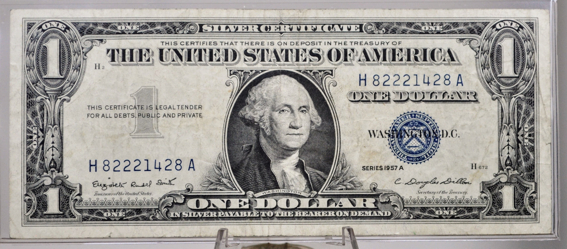 This listing is for the photographed 1957-A One Dollar Silver Certificate Fancy Serial Number Note. Choice Very Fine (VF+) grade/condition, as pictured. This note has an interesting repeating triple serial number, 82221428, making it a highly sought after find! Signed by Smith and Dillon. Great find, perfect addition to any collection! Fr.1620 (Friedburg Number 1620).